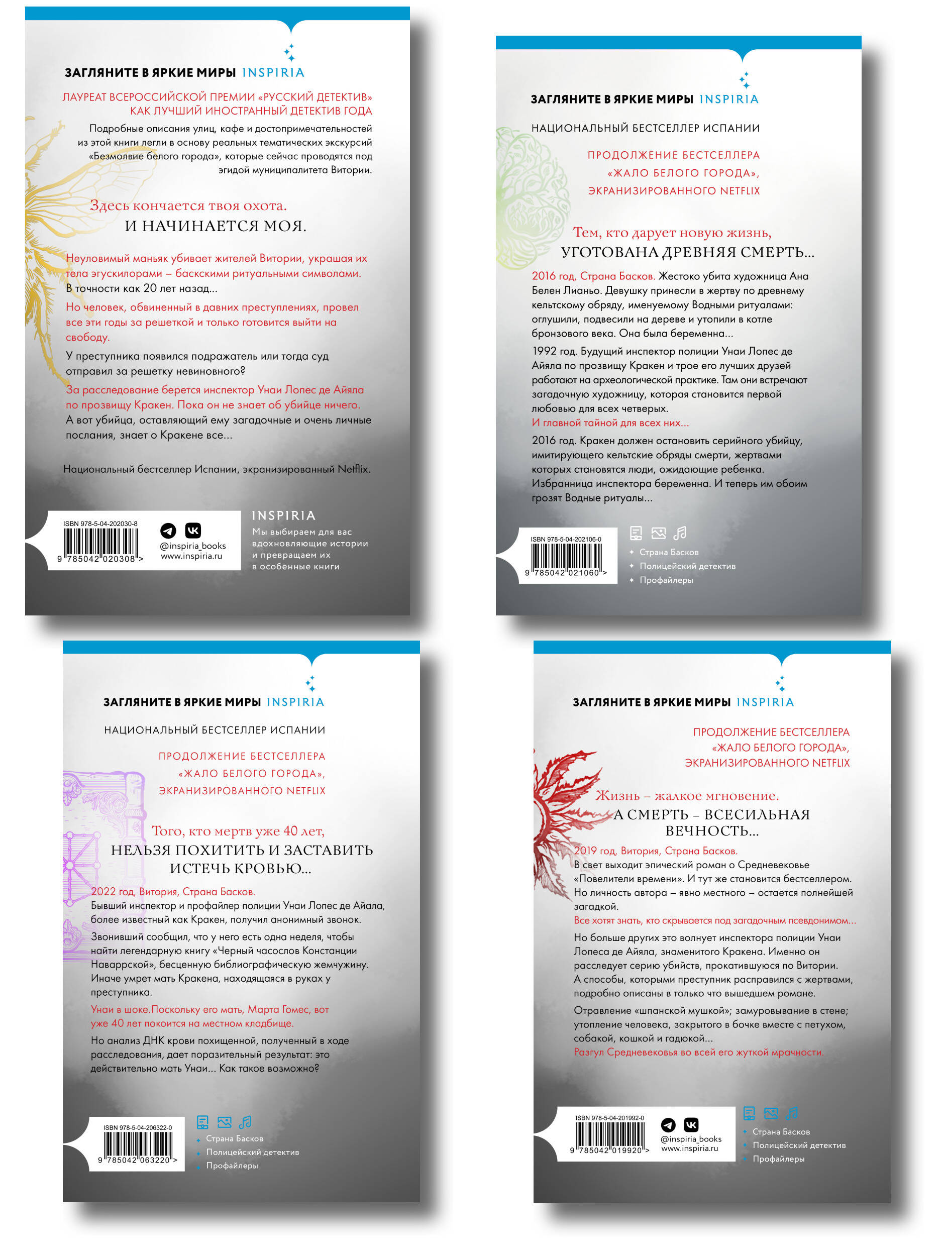 Жало белого города Неуловимый маньяк убивает жителей Витории, украшая их тела эгускилорами - баскскими ритуальными символами. В точности как 20 лет назад... Но человек, обвиненный в давних преступлениях, провел все эти годы за решеткой и только готовится выйти на свободу. У преступника появился подражатель или тогда суд отправил за решетку невиновного? За расследование берется инспектор Унаи Лопес де Айяла по прозвищу Кракен. Пока он не знает об убийце ничего. А вот убийца, оставляющий ему загадочные и очень личные послания, знает о Кракене все… Водные ритуалы 2016 год, Страна Басков. Жестоко убита художница Ана Белен Лианьо. Девушку принесли в жертву по древнему кельтскому обряду, именуемому Водными ритуалами: оглушили, подвесили на дереве и утопили в котле бронзового века. Она была беременна… 1992 год. Будущий инспектор полиции Унаи Лопес де Айяла по прозвищу Кракен и трое его лучших друзей работают на археологической практике. Там они встречают загадочную художницу, которая становится первой любовью для всех четверых. И главной тайной для всех них… 2016 год. Кракен должен остановить серийного убийцу, имитирующего кельтские обряды смерти, жертвами которых становятся люди, ожидающие ребенка. Избранница инспектора беременна. И теперь им обоим грозят Водные ритуалы… Корни ненависти 2019 год, Витория, Страна Басков. В свет выходит эпический роман о Средневековье "Повелители времени". И тут же становится бестселлером. Но личность автора - явно местного - остается полнейшей загадкой. Все хотят знать, кто скрывается под загадочным псевдонимом… Но больше других это волнует инспектора полиции Унаи Лопеса де Айяла, знаменитого Кракена. Именно он расследует серию убийств, прокатившуюся по Витории. А способы, которыми преступник расправился с жертвами, подробно описаны в только что вышедшем романе. Отравление "шпанской мушкой"; замуровывание в стене; утопление человека, закрытого в бочке вместе с петухом, собакой, кошкой и гадюкой… Разгул Средневековья во всей своей жуткой мрачности. Черный часослов 2022 год, Витория, Страна Басков. Бывший инспектор и профайлер полиции Унаи Лопес де Айала, более известный как Кракен, получил анонимный звонок. Звонивший сообщил, что у него есть одна неделя, чтобы найти легендарную книгу "Черный часослов Констанции Наваррской", бесценную библиографическую жемчужину. Иначе умрет мать Кракена, находящаяся в руках у преступника. Унаи в шоке. Поскольку его мать, Марта Гомес, вот уже 40 лет покоится на местном кладбище. Но анализ ДНК крови похищенной, полученный в ходе расследования, дает поразительный результат: это действительно мать Унаи… Как такое возможно?| Издательство | ООО "Издательство "Эксмо" |