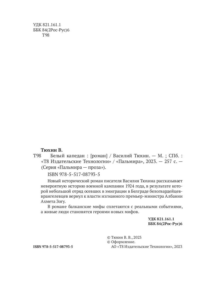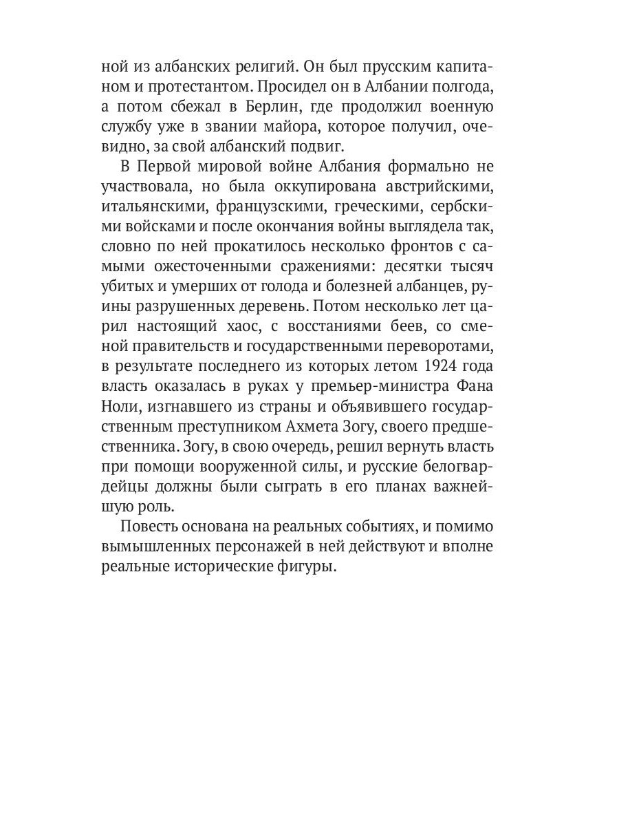 Новый исторический роман писателя Василия Тюхина рассказывает невероятную историю военной кампании 1924 года, в результате которой небольшой отряд осевших в эмиграции в Белграде белогвардейцев-врангелевцев вернул к власти изгнанного премьер-министра Албании Ахмета Зогу. В романе балканские мифы сплетаются с реальными событиями, а живые люди становятся героями новых мифов.| Издательство | Т8 RUGRAM |