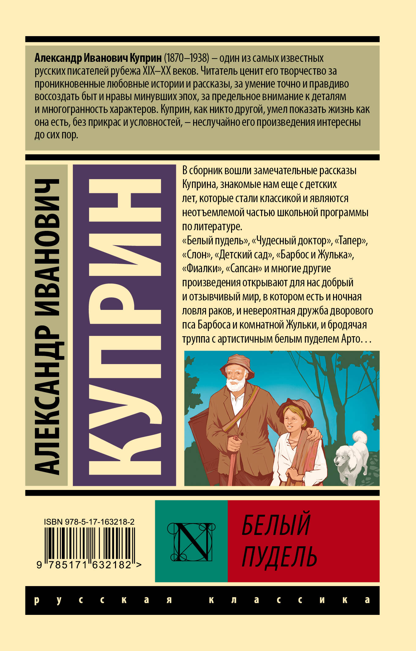 В сборник вошли замечательные рассказы Куприна, знакомые нам еще с детских лет, которые стали классикой и являются неотъемлемой частью школьной программы по литературе. "Белый пудель", "Чудесный доктор", "Тапер", "Слон", "Детский сад", "Барбос и Жулька", "Фиалки", "Сапсан" и многие другие произведения открывают для нас добрый и отзывчивый мир, в котором есть и ночная ловля раков, и невероятная дружба дворового пса Барбоса и комнатной Жульки, и бродячая труппа с артистичным белым пуделем Арто…| Издательство | Издательство "АСТ" |