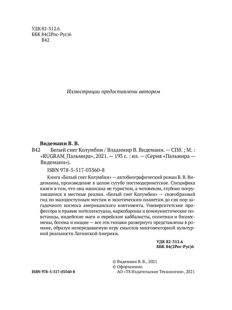 Книга «Белый снег Колумбии» - автобиографический роман В.В. Видеманна, произведение в целом сугубо постмодернистское. Специфика книги в том, что она написана не туристом, а человеком, глубоко погрузившимся в местные реалии. «Белый снег Колумбии» - своеобразный гид по малодоступным местам и экзотическим планетам до сих пор загадочного космоса американского континента. Университетские профессора и правые интеллектуалы, наркобароны и коммунистические повстанцы, индейские маги и еврейские каббалисты, политики и бизнесмены, богема и нищие - все эти типажи развернуто представлены в романе, образуя непередаваемую игру смыслов многовекторной культурной реальности Латинской Америки