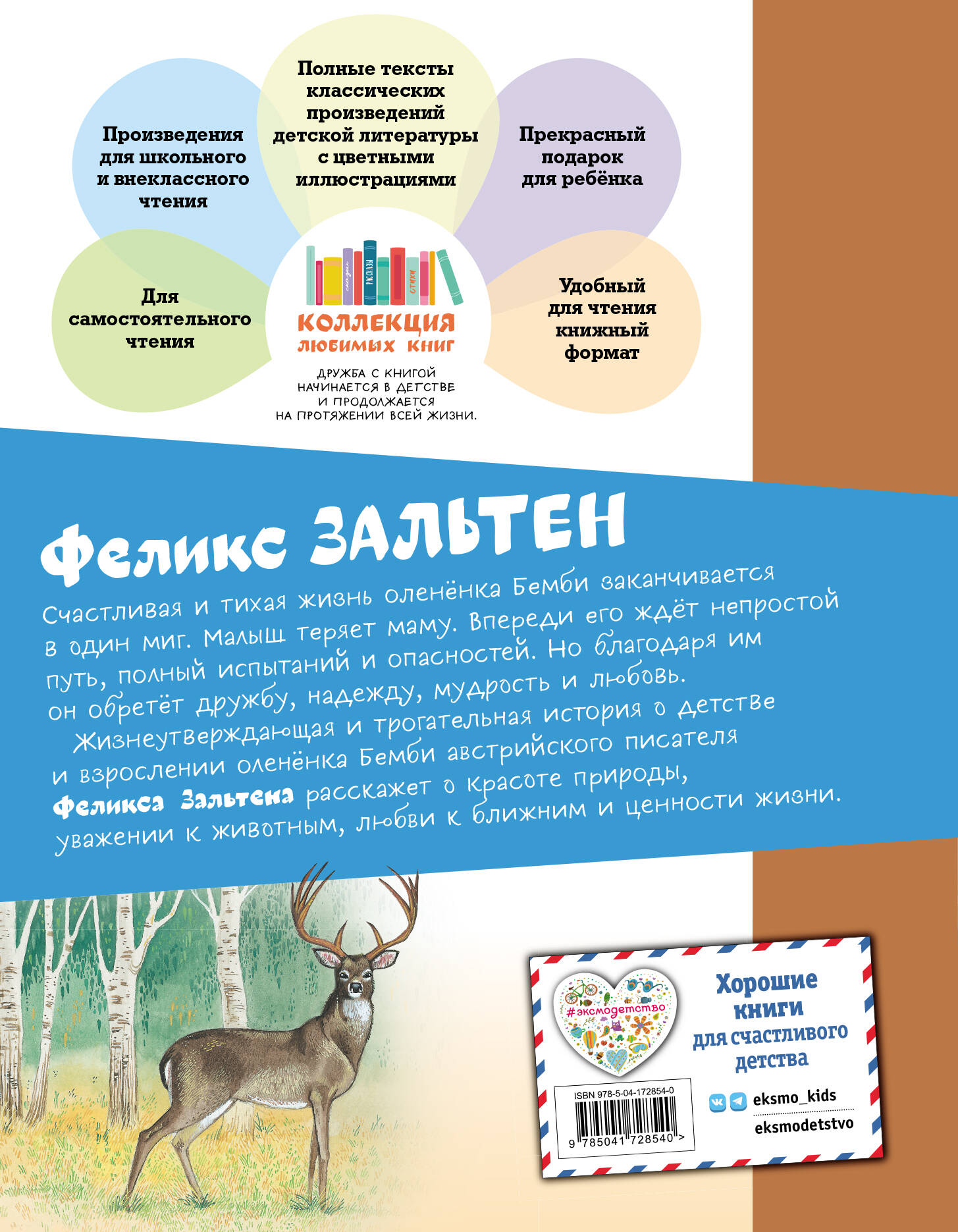 Смышлёный и любознательный малыш Бемби вместе с мамой живет в лесу. Во время ежедневных прогулок он наблюдает за лесными жителями, заводит себе друзей, понемногу открывает для себя красоту и законы окружающего мира. Но в один прекрасный день он узнаёт о Нём, и после этого жизнь оленёнка делится на «до» и «после». Трогательная и душевная история о понимании красоты, взрослении, дружбе и любви. Произведение входит в список по внеклассному чтению. Красочные и выразительные иллюстрации известного российского художника Максима Митрофанова. «КОЛЛЕКЦИЯ ЛЮБИМЫХ КНИГ» - это: - детская классика с цветными иллюстрациями известных художников; - произведения для школьного и внеклассного чтения; - отличный выбор для самостоятельного чтения; - прекрасный подарок для ребёнка; - единое серийное оформление, дающее возможность собрать свою книжную коллекцию.