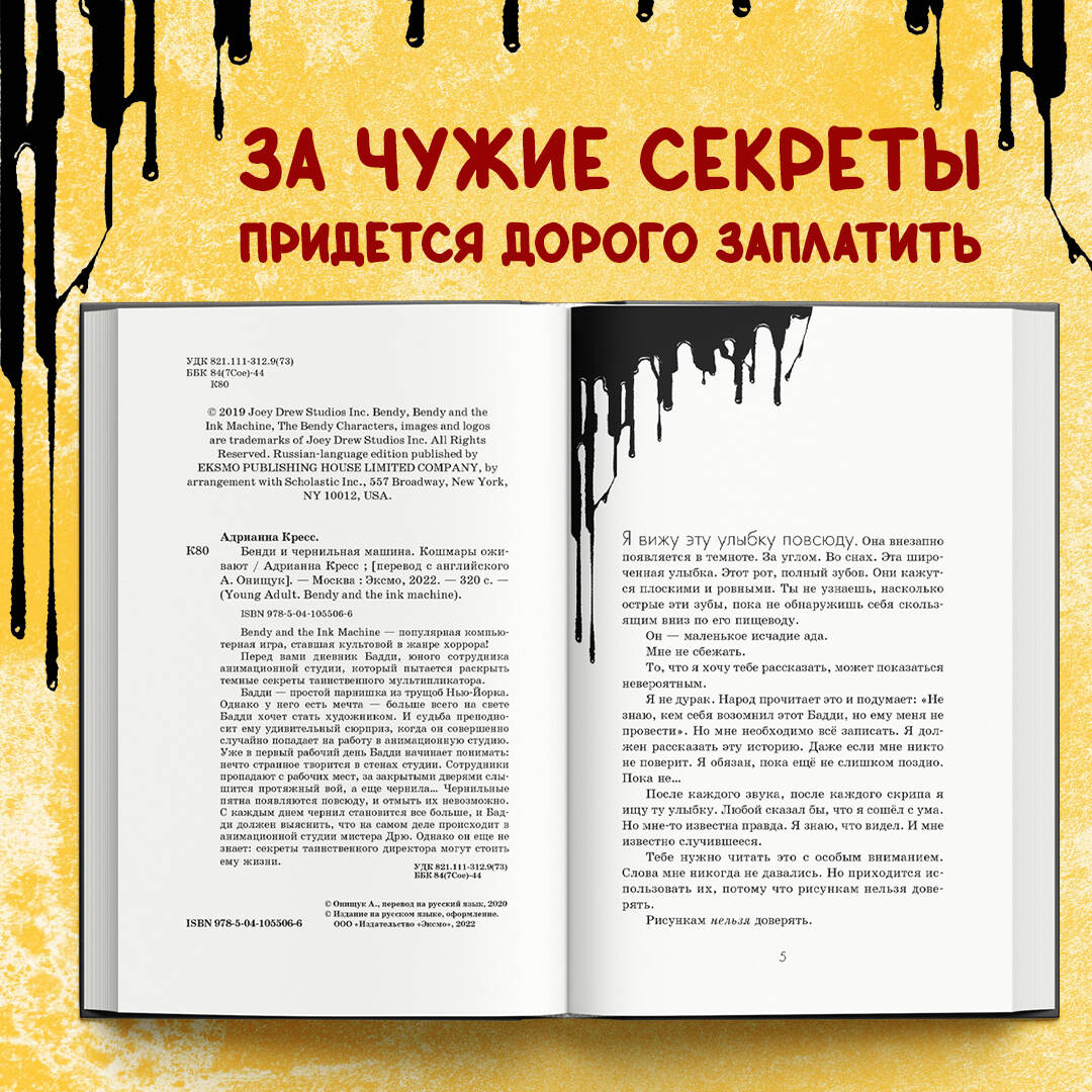 Официальная суперновинка от разработчиков хоррор-игры «Bendy and the ink machine». Перед вами дневник Бадди, юного сотрудника анимационной студии, который пытается раскрыть темные секреты таинственного мультипликатора. Бадди - простой парнишка из трущоб Нью-Йорка. Однако у него есть мечта - больше всего на свете Бадди хочет стать художником. И судьба преподносит ему удивительный сюрприз, когда он совершенно случайно попадает на работу в анимационную студию. Уже в первый рабочий день Бадди начинает понимать: нечто странное творится в стенах студии. Сотрудники пропадают с рабочих мест, за закрытыми дверями слышится протяжный вой, а еще чернила… Чернильные пятна появляются повсюду, и отмыть их невозможно. С каждым днем чернил становится все больше и Бадди должен выяснить, что на самом деле происходит в анимационной студии мистера Дрю. Однако он еще не знает: секреты таинственного директора могут стоить ему жизни. Захватывающая книга ужасов, которая станет отличным подарком для всех фанатов игры «Bendy and the ink machine» и любителей мистических историй! Вы можете ближе познакомиться с миром игры, узнать ее предысторию и заглянуть за рамки основного сюжета. Книга создана при участии непосредственных разработчиков игры: theMeatly, Mike Mood и Bookpast.| Издательство | ООО "Издательство "Эксмо" |