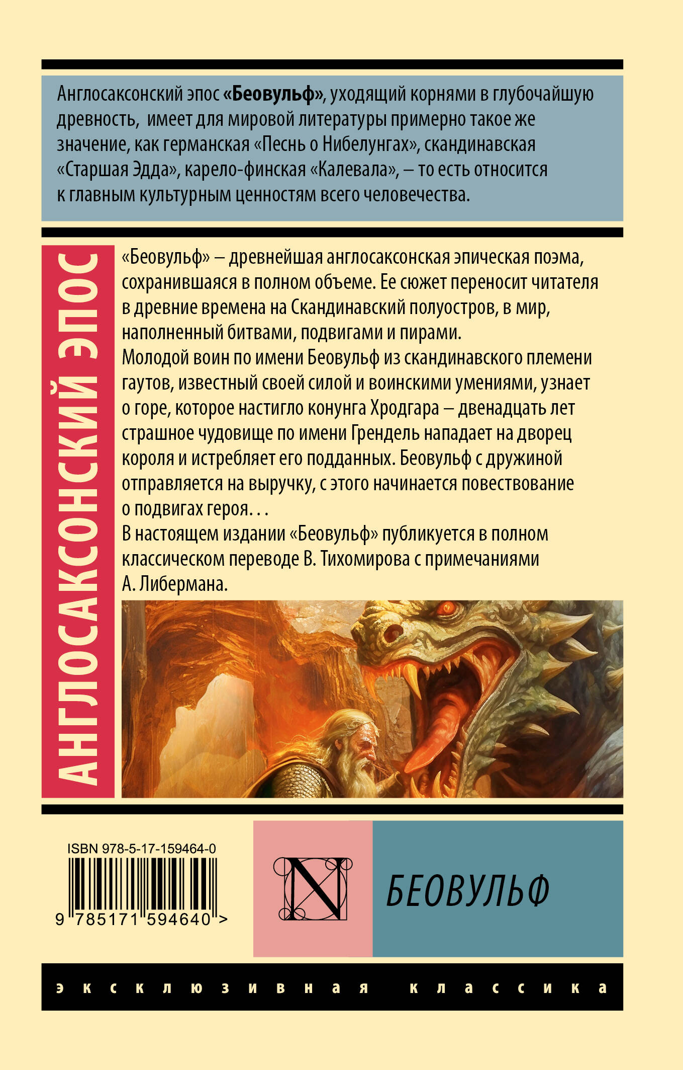 "Беовульф" - древнейшая англосаксонская эпическая поэма, сохранившаяся в полном объеме. Ее сюжет переносит читателя в древние времена на Скандинавский полуостров, в мир, наполненный битвами, подвигами и пирами. Молодой воин по имени Беовульф из скандинавского племени гаутов, известный своей силой и воинскими умениями, узнает о горе, которое настигло конунга Хродгара, - двенадцать лет страшное чудовище по имени Грендель нападает на дворец короля и истребляет его подданных. Беовульф с дружиной отправляется на выручку, с этого начинается повествование о подвигах героя… В настоящем издании "Беовульф" публикуется в полном классическом переводе В. Тихомирова с примечаниями А. Либермана.| Издательство | Издательство "АСТ" |