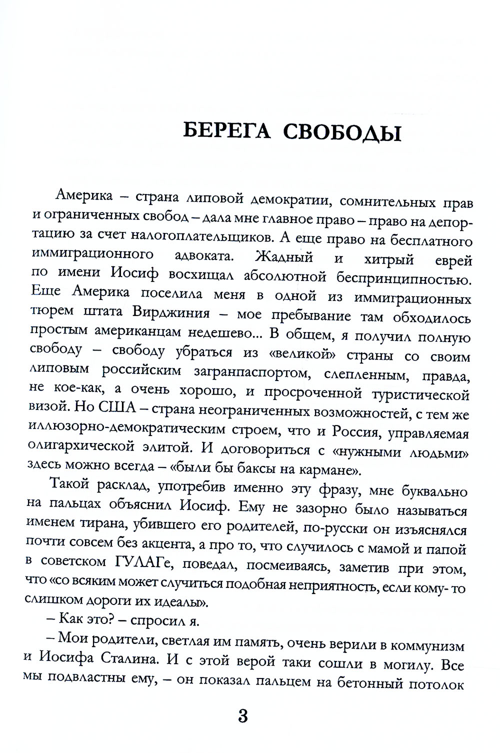 США - страна-витрина западной демократии, сомнительных прав и ограниченных свобод. Главный герой романа получил главное право - право на депортацию за счет налогоплательщиков, и получил полную свободу - свободу убраться из оплота демократии со совим фальшивым российским заграничным паспортом. Но США - страна неограниченной демократии и безграничных возможностей, «были бы баксы на кармане». Степан проходит путь от нищего эмигранта до бандита и миллионера.| Издательство | Т8 RUGRAM |