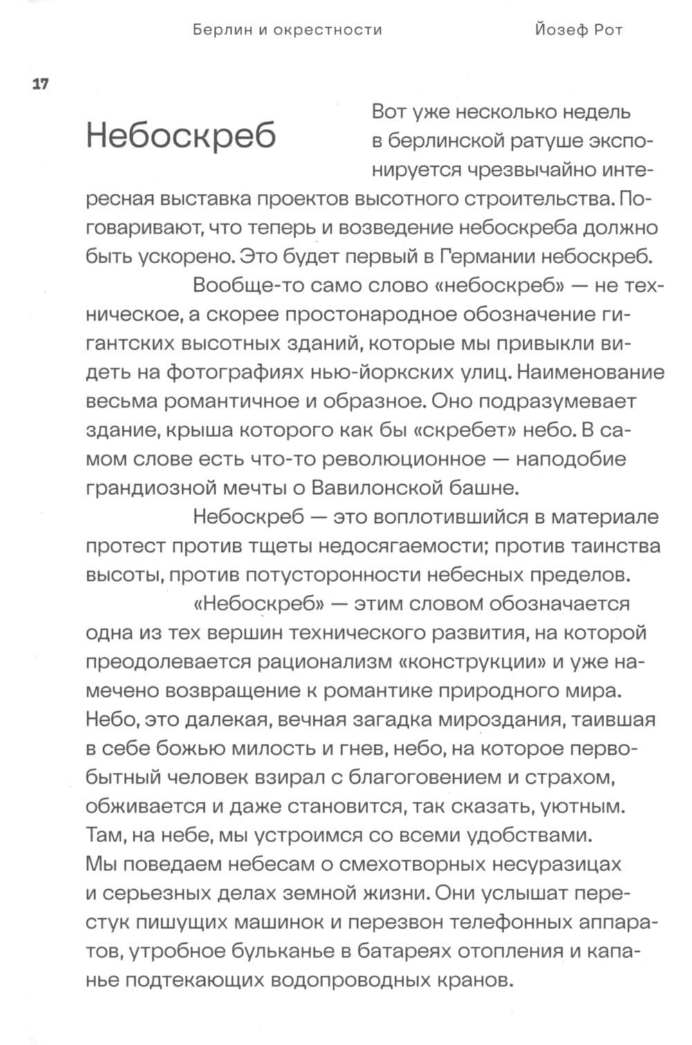 В сборник очерков и статей австрийского писателя и журналиста, составленный известным переводчиком-германистом М.Л. Рудницким, вошли тексты, написанные Йозефом Ротом для берлинских газет в 1920-1930-е годы. Во времена Веймарской республики Берлин оказался местом, где рождался новый урбанистический ландшафт послевоенной Европы. С одной стороны, город активно перестраивался и расширялся, с другой - война, уличная политика и экономическая стагнация как бы перестраивали изнутри его жителей и невольных гостей-иммигрантов. Динамическая картина этого бурлящего мегаполиса, набросанная в газетных колонках Йозефа Рота, и сегодня читается как живой репортаж о жизни города, который опять стал местом сопряжения различных культур. Писатель создает галерею городских типов и уличных сценок, чем-то напоминающих булгаковскую Москву, где место фантастики занимают наблюдательность и уникальный берлинский стиль. Издание сопровождается архивными фотографиями.| Издательство | Ад Маргинем Пресс |
