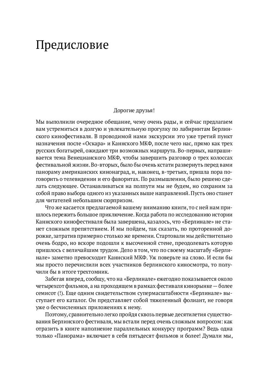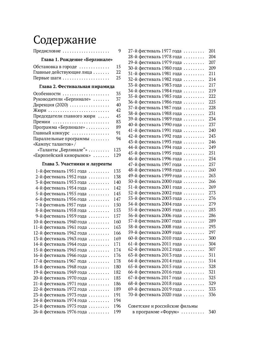 Вниманию читателей предлагаются исторические очерки, хроники противостояния двух политических систем, подробные характеристики каждой секции фестиваля, биографии главных действующих лиц и председателей жюри, списки участников главного конкурса и призеров, статистические сведения, аннотированный каталог фильмов-лауреатов и, конечно же, обозрение фестивальной жизни каждого «Берлинале».