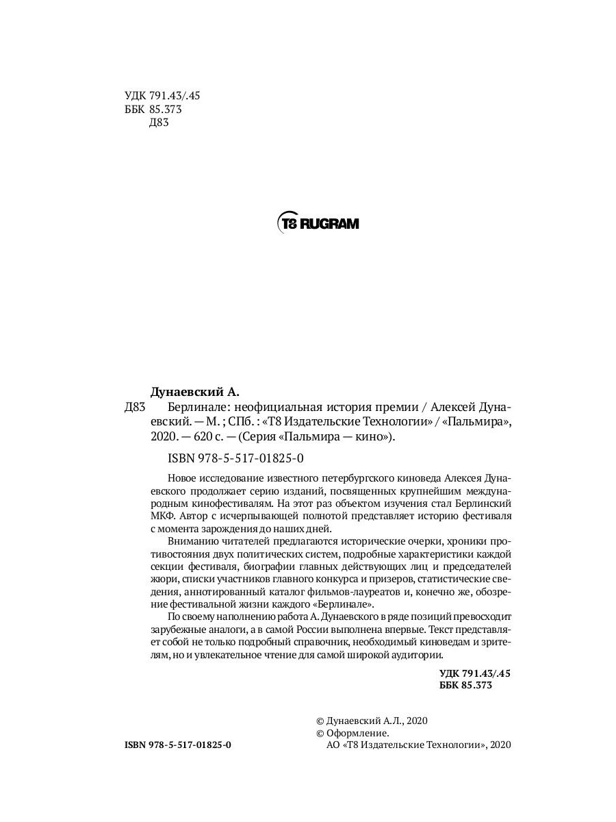 Новое исследование известного петербургского киноведа Алексея Дунаевского продолжает серию изданий, посвященных крупнейшим международным кинофестивалям. На этот раз объектом изучения стал Берлинский МКФ. Автор с исчерпывающей полнотой представляет историю фестиваля с момента зарождения до наших дней.