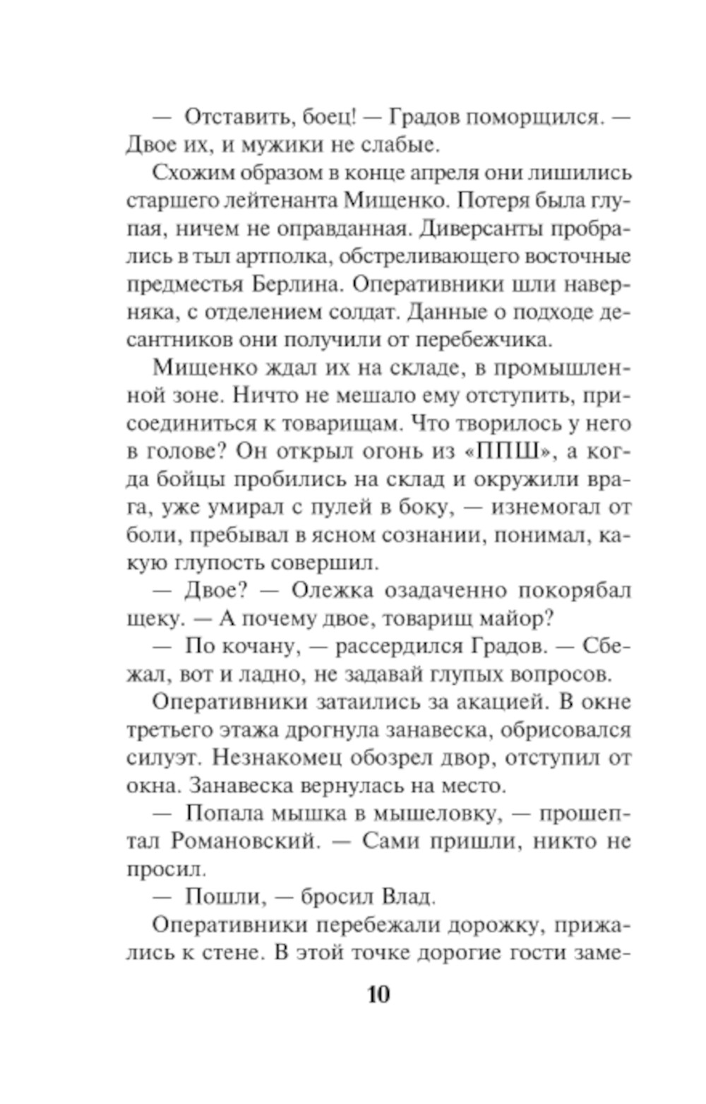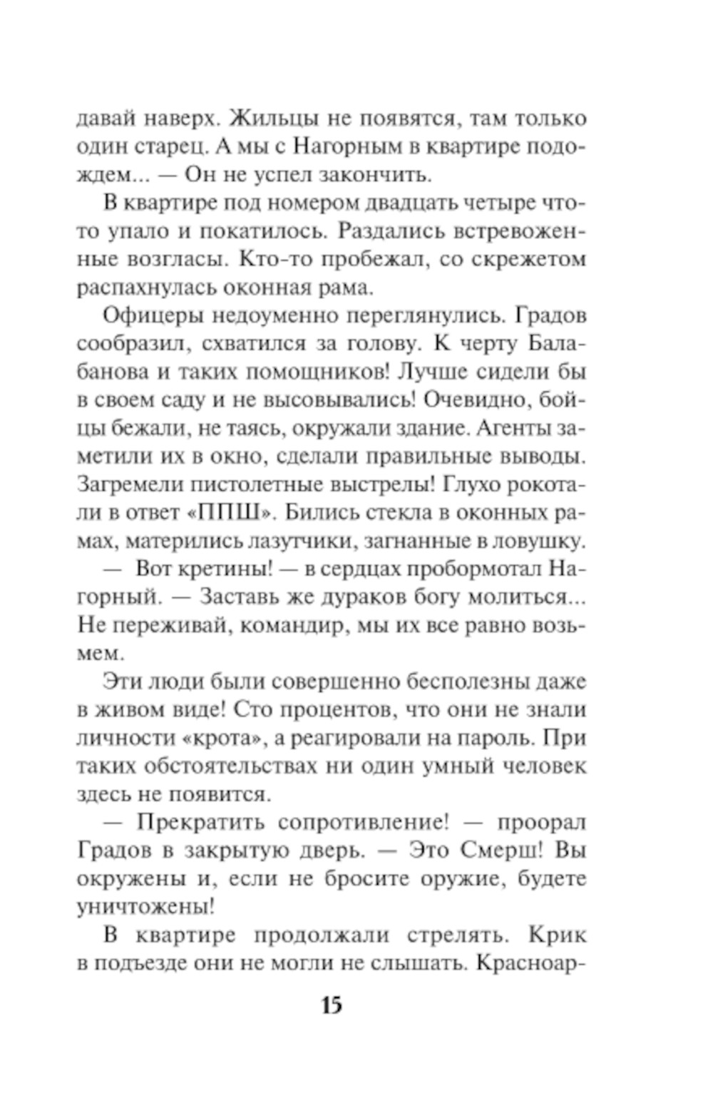 Самые интересные романы о сталинском спецназе - СМЕРШе. Май 1945 года. Только что закончилась Великая Отечественная война. Но бывшие союзники СССР, англичане, не желают мириться с ее результатами. Они разрабатывают план вытеснения частей Красной Армии из Берлина, чтобы ослабить советское влияние на оккупированной территории. В нашем штабе действует «крот», который снабжает британцев секретными данными. Выявить и обезвредить предателя поручено майору СМЕРШа Владиславу Градову. Чтобы выполнить поставленную задачу, ему предстоит вжиться в непривычную для себя роль... «Смерть шпионам!» (СМЕРШ) - это короткое и беспощадное название носило особое подразделение НКВД, подчинявшееся И. Сталину. Созданное в годы войны, оно состояло из проверенных в бою, честных и бесстрашных офицеров Красной Армии. СМЕРШа боялись все - и фашистские лазутчики, готовящие диверсии в наших боевых порядках, и гитлеровские приспешники, действующие в глубоком советском тылу. Враг знал: если на его след напали бойцы сталинского спецназа, справедливого и скорого суда не избежать. Романы серии «СМЕРШ - спецназ Сталина» - это каждый раз увлекательный динамичный сюжет и новые исторические знания, это экшен, написанный простым и понятным языком.| Издательство | Эксмо |