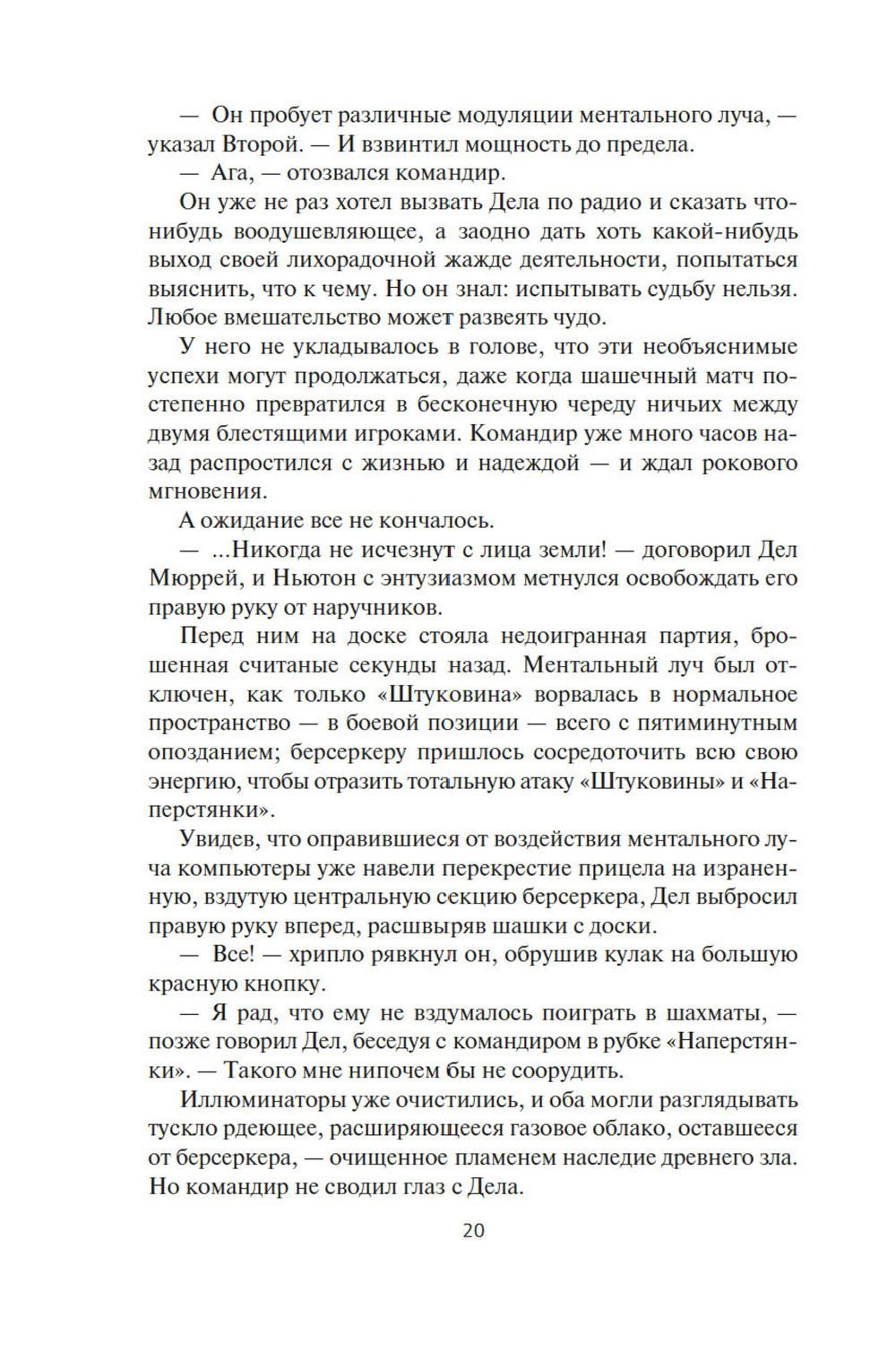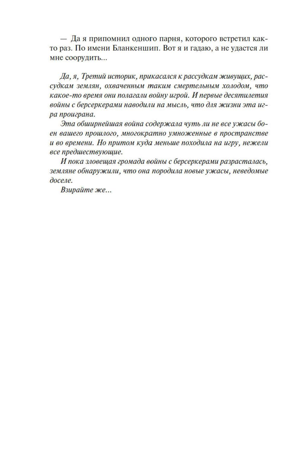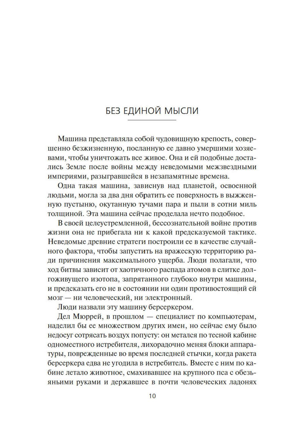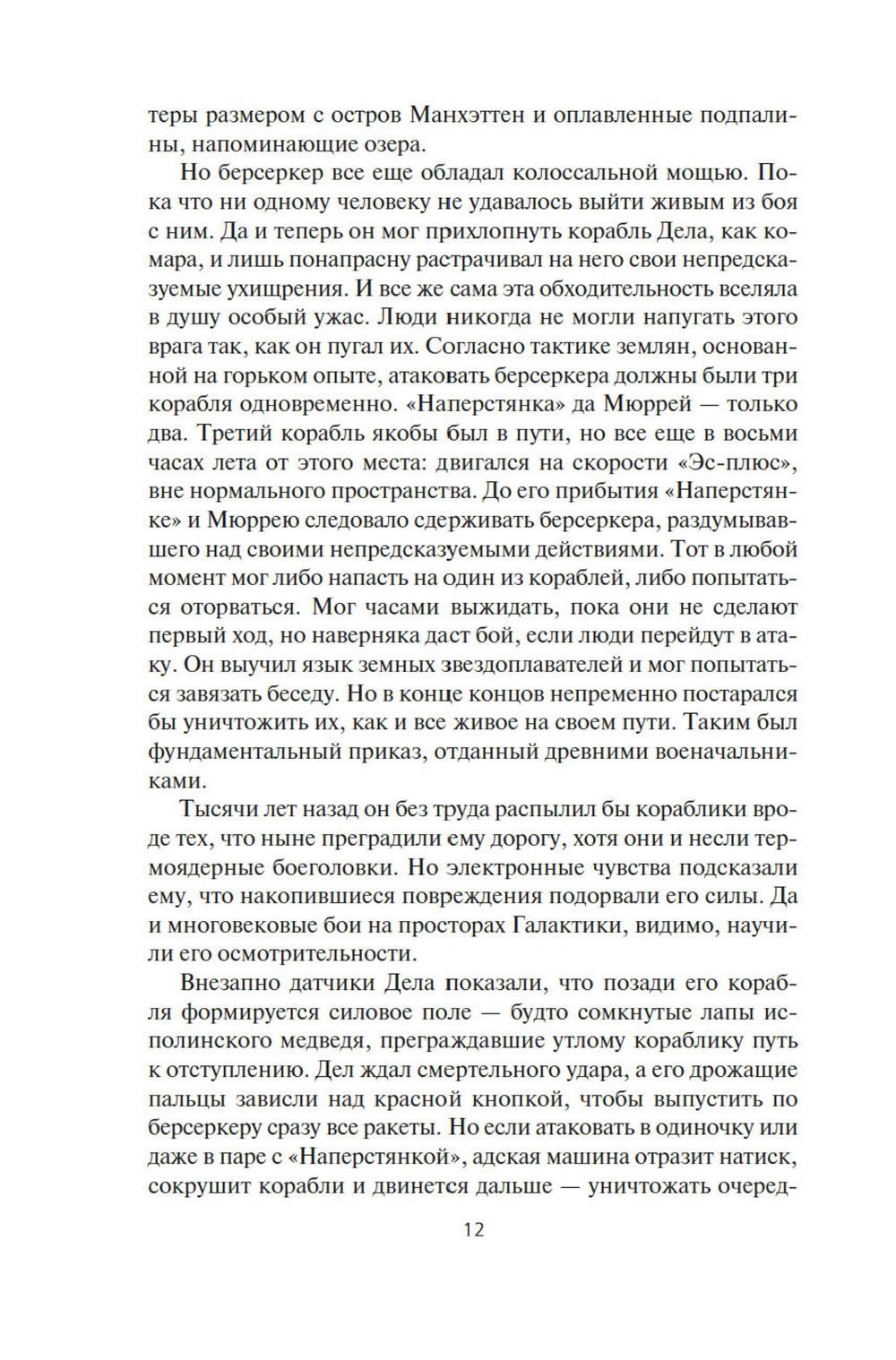 СОДЕРЖИТ ИНФОРМАЦИЮ О НАРКОТИЧЕСКИХ ИЛИ ПСИХОТРОПНЫХ ВЕЩЕСТВАХ, УПОТРЕБЛЕНИЕ КОТОРЫХ ОПАСНО ДЛЯ ЗДОРОВЬЯ. ИХ НЕЗАКОННЫЙ ОБОРОТ ВЛЕЧЕТ УГОЛОВНУЮ ОТВЕТСТВЕННОСТЬ. Давным-давно где-то в глубинах Вселенной встретились две расы разумных существ, и начали войну на взаимное уничтожение, и преуспели в этом. Единственное наследие той войны - абсолютное оружие, которое ей же и положило конец, машины-убийцы, наделенные компьютерным сознанием. Продвигаясь по Галактике, эти корабли величиной с планету уничтожают на своем пути все живое, потому что такова главная задача, заложенная в них создателями. И теперь они добрались до окраин освоенного людьми космоса. Люди нарекли их берсеркерами. Люди тоже умеют воевать. Люди приняли вызов. В этот сборник вошли первые произведения цикла. В «Маске Марса» человеческой психике снова и снова придется вступать в единоборство с ничуть не менее изощренной и противоречивой психикой машин. В «Брате берсеркере» война продолжится не только в пространстве, но и во времени. А в «Планете смерти» израненный и обезумевший вражеский корабль найдет себе тайное убежище и даже создаст собственный религиозный культ.| Издательство | Азбука |