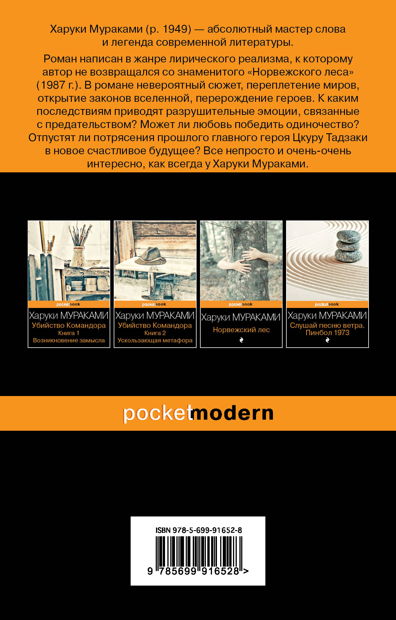 Роман написан в жанре лирического реализма, к которому автор не возвращался с романа «Норвежский лес» (1987 г.). В новом романе невероятный сюжет, переплетение миров, открытие законов вселенной, перерождение героев. К каким последствиям приводят разрушительные эмоции, связанные с предательством? Может ли любовь победить одиночество? Неужели возможно стать другим человеком как снаружи, так и внутри? Могут ли скрытые эмоции оставаться скрытыми? Отпустят ли потрясения прошлого главного героя Цкуру Тадзаки в новое счастливое будущее? Все непросто и очень-очень интересно, как всегда у Харуки Мураками. Погружаешься молниеносно, и не освободиться, пока не дочитаешь до конца!| Издательство | ООО "Издательство "Эксмо" |