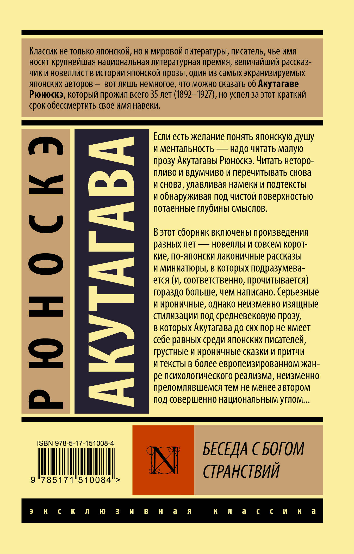 Если есть желание понять японскую душу и ментальность - надо читать малую прозу Акутагавы Рюноскэ. Читать неторопливо и вдумчиво и перечитывать снова и снова, улавливая намеки и подтексты и обнаруживая под чистой поверхностью потаенные глубины смыслов. В этот сборник включены произведения разных лет - новеллы и совсем короткие, по-японски лаконичные рассказы и миниатюры, в которых подразумевается (и, соответственно, прочитывается) гораздо больше, чем написано. Серьезные и ироничные, однако неизменно изящные стилизации под средневековую прозу, в которых Акутагава до сих пор не имеет себе равных среди японских писателей, грустные и ироничные сказки и притчи и тексты в более европеизированном жанре психологического реализма, неизменно преломлявшемся тем не менее автором под совершенно национальным углом...| Издательство | ИЗДАТЕЛЬСТВО "АСТ" |