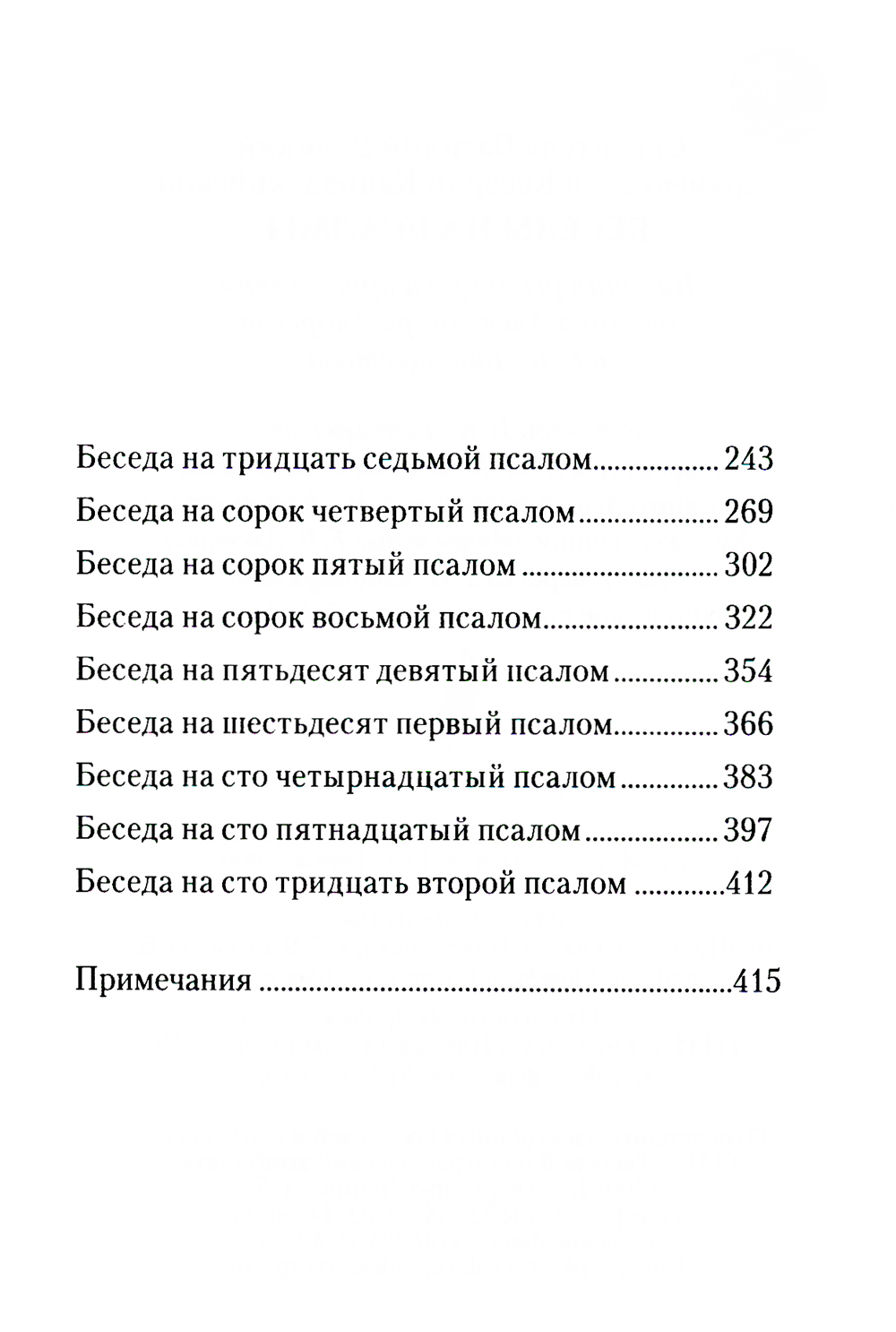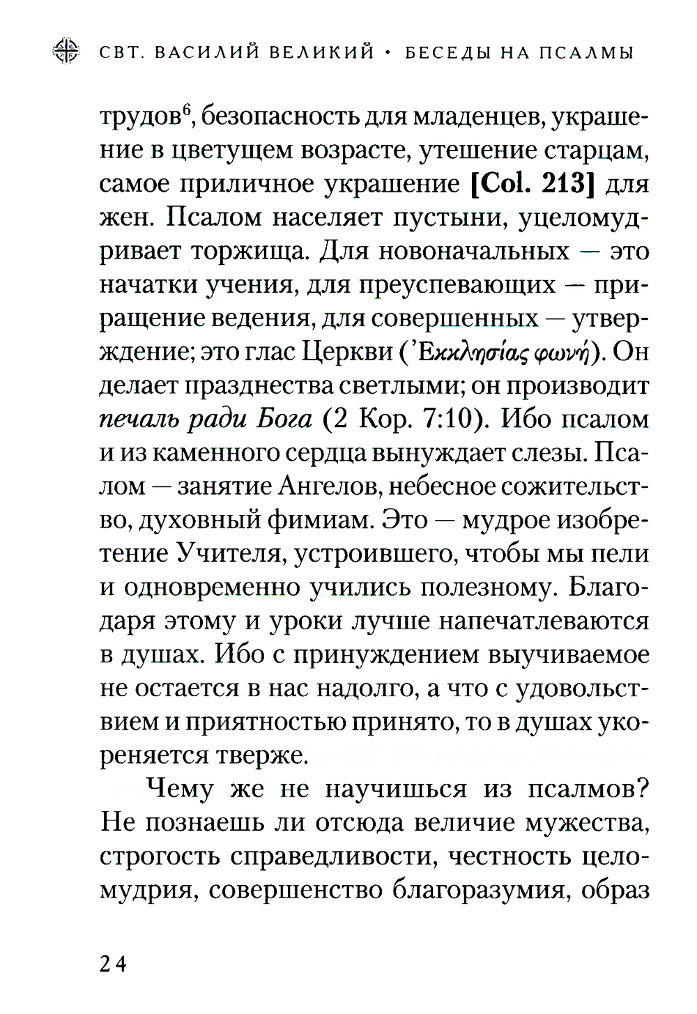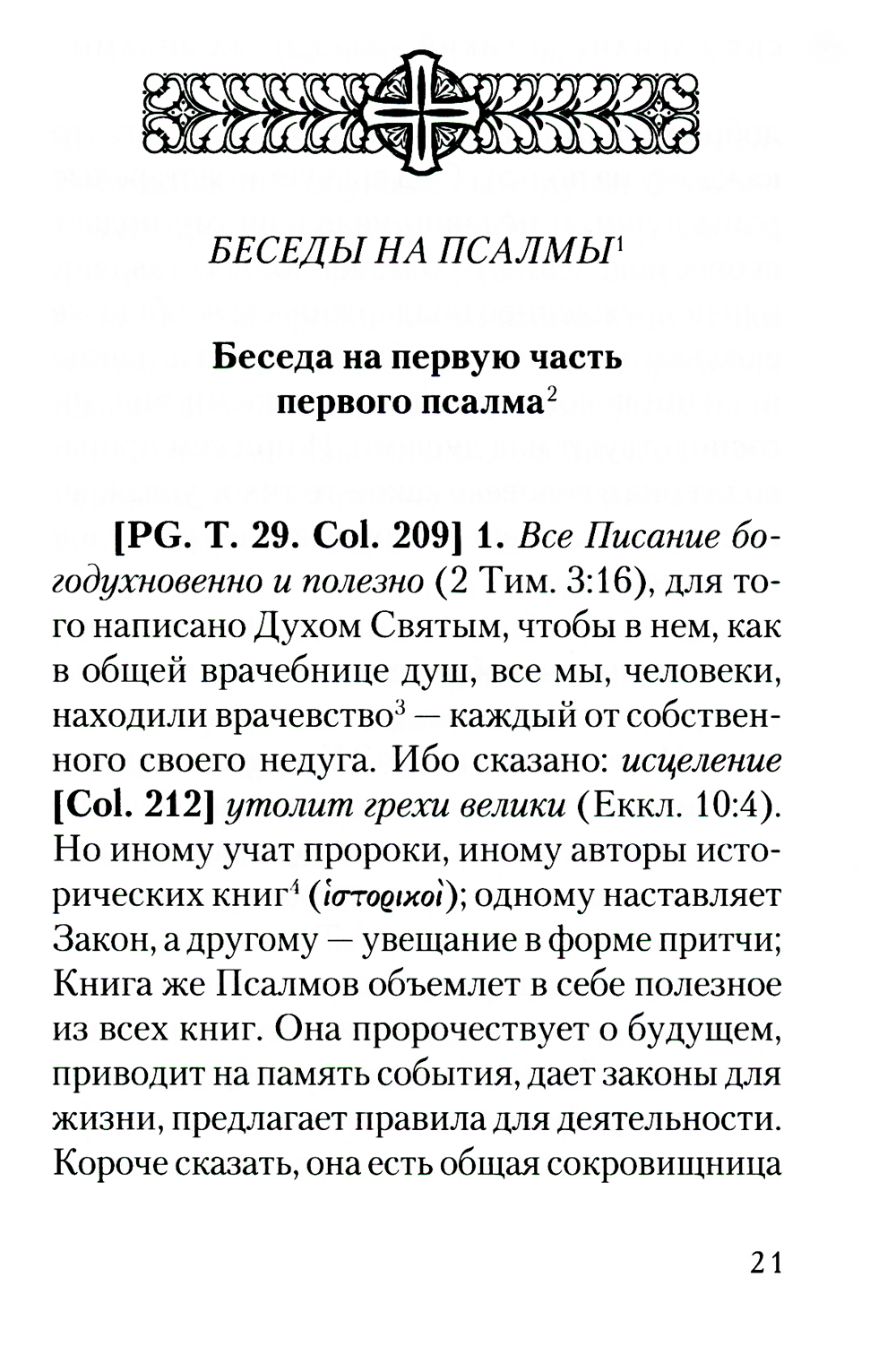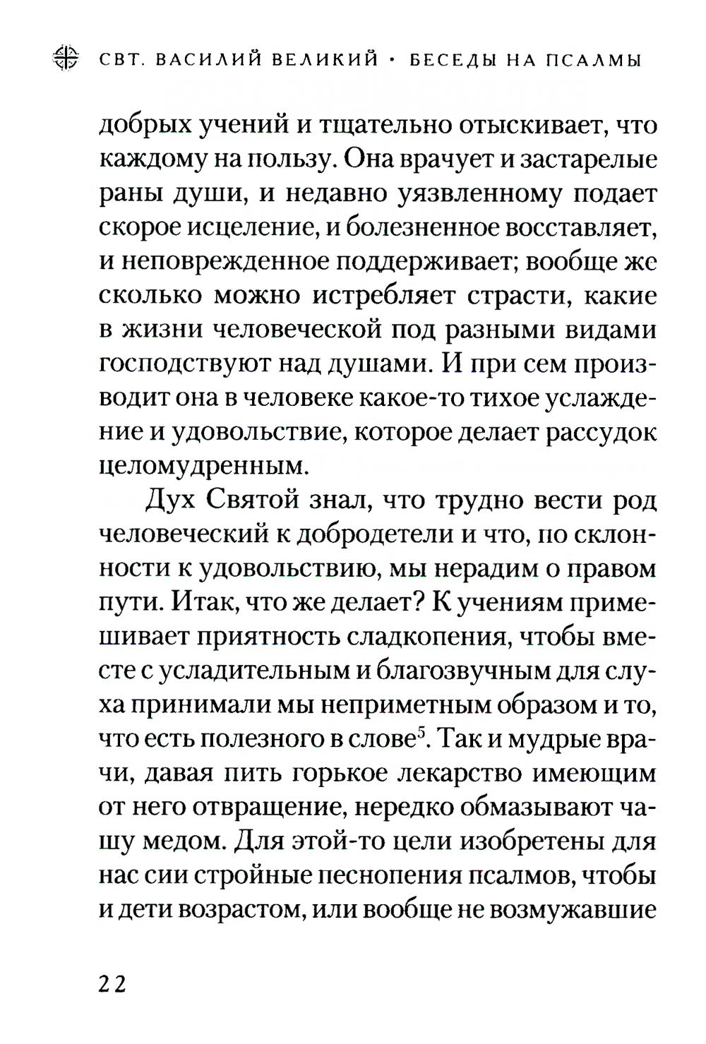 «Беседы на псалмы» - классический экзегетический труд великого отца и учителя Церкви святителя Василия Великого (330-379), архиепископа Кесарии Каппадокийской. Это собрание проповедей на самую читаемую в богослужебной традиции христианской Церкви книгу Ветхого Завета - Псалтирь святого пророка и царя Давида. В предлагаемом издании «Бесед на псалмы» впервые собраны все сохранившиеся восемнадцать бесед. Толкования свт. Василия открывают богатство библейско-богословского и нравственно-аскетического содержания этой ветхозаветной пророческой книги и позволяют более глубоко проникнуть и смысл Божиих глаголов Священного Писания.| Издательство | Сибирская Благозвонница* |