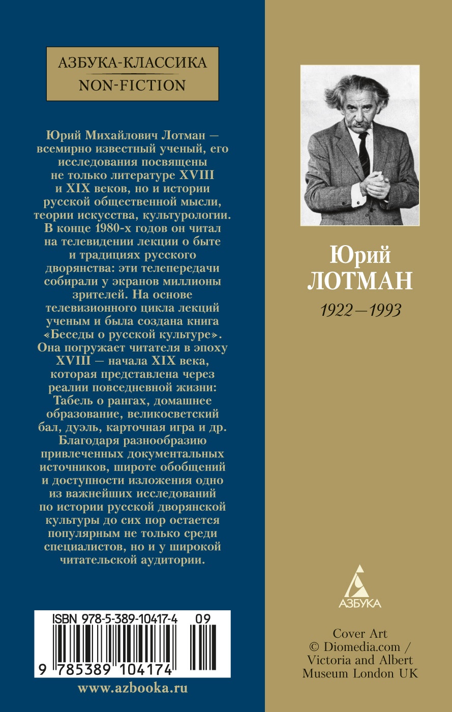 Юрий Михайлович Лотман - всемирно известный ученый, филолог и культуролог, чьи труды переведены на все основные европейские языки. Его творческое наследие чрезвычайно обширно и насчитывает около восьмисот научных и научно-популярных статей и книг. Как и многим выдающимся ученым, Ю.B М.B Лотману было трудно оставаться в рамках одной научной дисциплины: его исследования были посвящены не только литературе XVIII и XIX веков, но и истории русской общественной мысли, теории искусства, культурологии. В конце 1980-х годов он читал на телевидении лекции о быте и традициях русского дворянства: эти телепередачи собирали у экранов миллионы зрителей. На основе телевизионного цикла лекций ученым и была создана книга «Беседы о русской культуре». Она погружает читателя в эпоху XVIII - начала XIX века, которая представлена через реалии повседневной жизни: табель о рангах, домашнее образование, великосветский бал, дуэль, карточная игра и др. Благодаря разнообразию привлеченных документальных источников, широте обобщений и доступности изложения одно из важнейших исследований по истории русской дворянской культуры до сих пор остается популярным не только среди специалистов, но и у широкой читательской аудитории.| Издательство | Азбука |