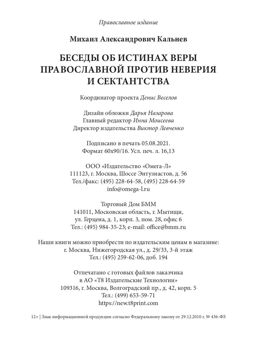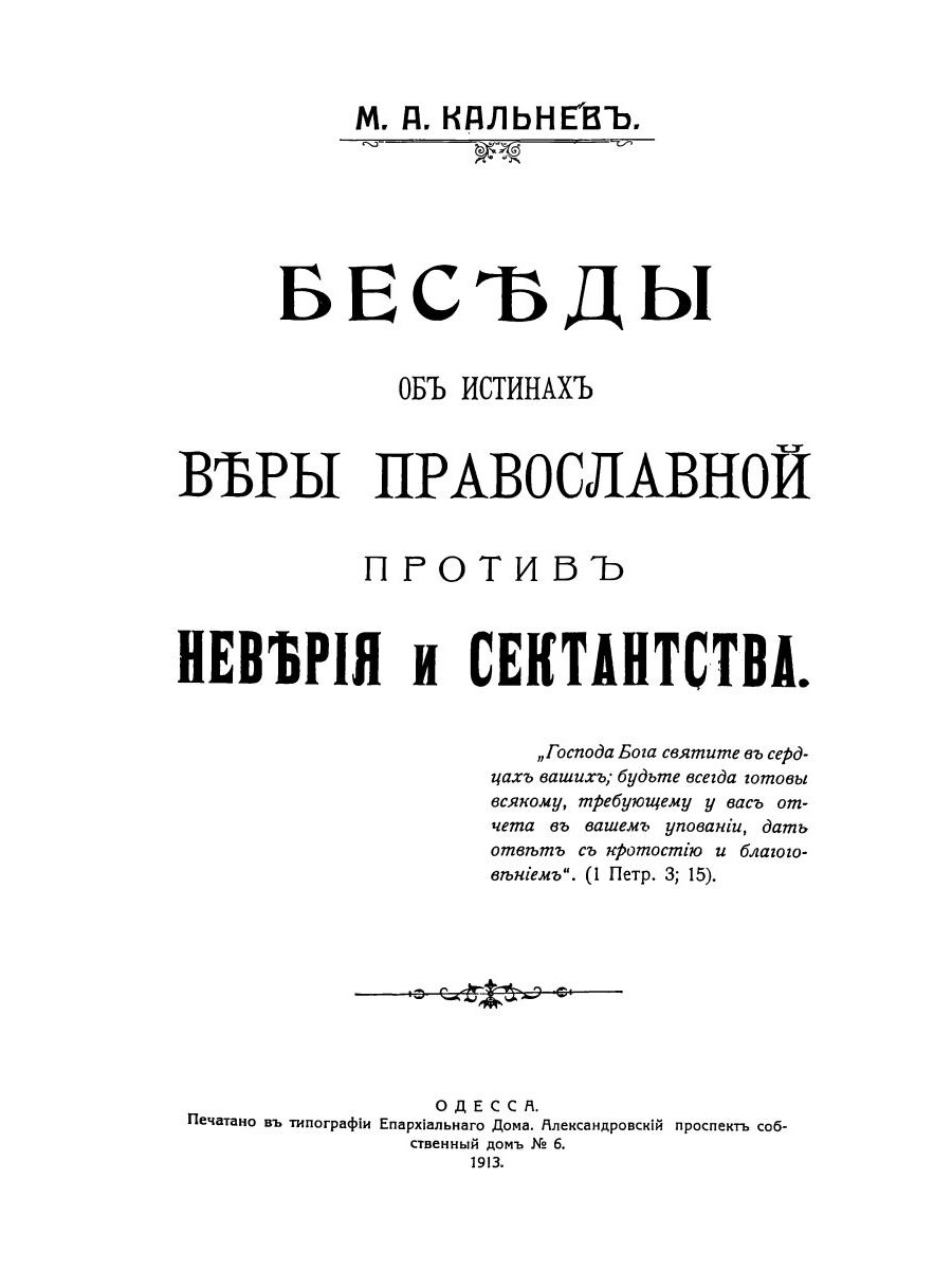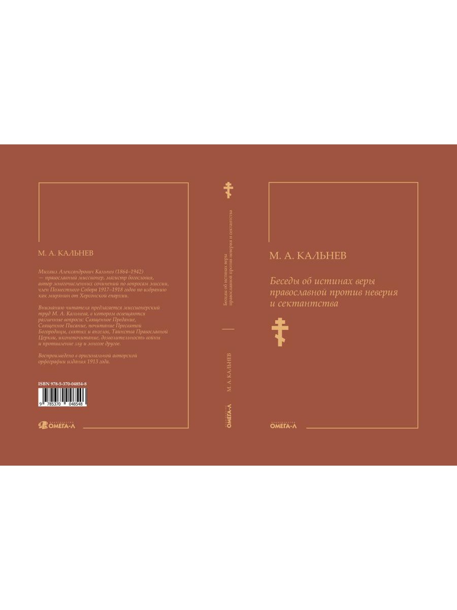 Михаил Александрович Кальнев (1864-1942) - православный миссионер, магистр богословия, автор многочисленных сочинений по вопросам миссии, член Поместного Собора 1917-1918 годов по избранию как мирянин от Херсонской епархии. Вниманию читателя предлагается миссионерский труд М. А. Кальнева, в котором освещаются различные вопросы: Священное Предание, Священное Писание, почитание Пресвятой Богородицы, святых и ангелов, Таинства Православной Церкви, иконопочитание, дозволительность войны и противление злу и многое другое. Воспроизведено в оригинальной авторской орфографии издания 1913 года (Одесса : тип. Епархиального Дома, 1913. - [4], 254 с.).| Издательство | Омега-Л |