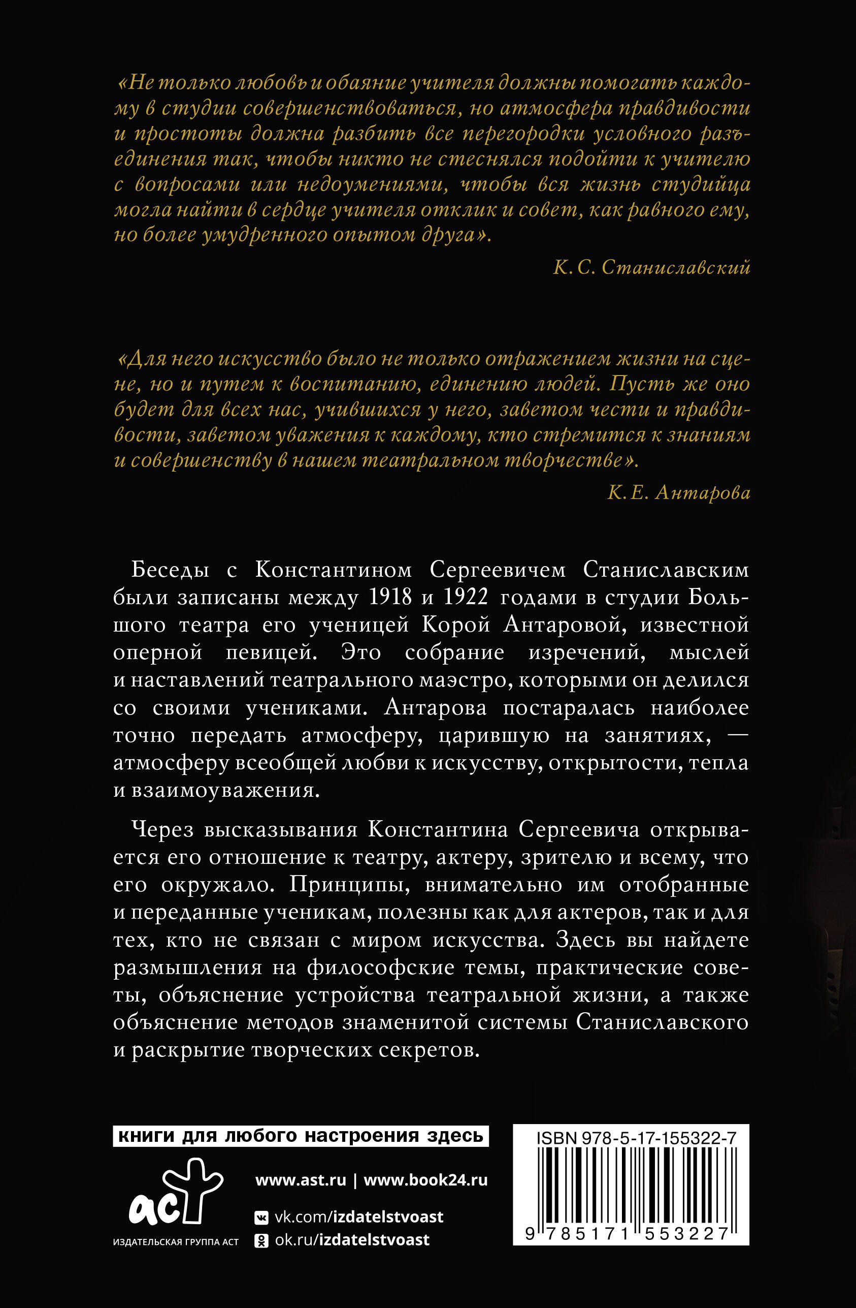 Беседы с Константином Сергеевичем Станиславским были записаны между 1918 и 1922 годами в студии Большого театра его ученицей Корой Антаровой, известной оперной певицей. Это собрание изречений, мыслей и наставлений театрального маэстро, которыми он делился со своими учениками. Антарова постаралась наиболее точно передать атмосферу, царившую на занятиях, - атмосферу всеобщей любви к искусству, открытости, тепла и взаимоуважения. Через высказывания Константина Сергеевича открывается его отношение к театру, актеру, зрителю и всему, что его окружало. Принципы, внимательно им отобранные и переданные ученикам, полезны как для актеров, так и для тех, кто не связан с миром искусства. Здесь вы найдете размышления на философские темы, практические советы, объяснение устройства театральной жизни, а также объяснение методов знаменитой системы Станиславского и раскрытие творческих секретов.| Издательство | ИЗДАТЕЛЬСТВО "АСТ" |