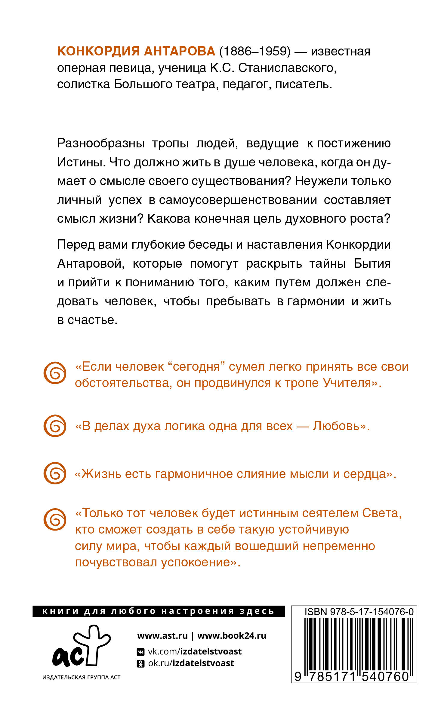 Конкордия Антарова (1886-1959) - известная оперная певица, ученица К.С. Станиславского, солистка Большого театра, педагог, писатель. Разнообразны тропы людей, ведущие к постижению Истины. Что должно жить в душе человека, когда он думает о смысле своего существования? Неужели только личный успех в самоусовершенствовании составляет смысл жизни? Какова конечная цель духовного роста? Перед вами глубокие беседы и наставления Конкордии Антаровой, которые помогут раскрыть тайны Бытия и прийти к пониманию того, каким путем должен следовать человек, чтобы пребывать в гармонии и жить в счастье.| Издательство | Издательство "АСТ" |