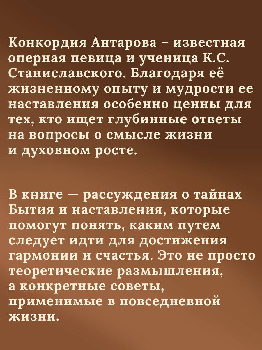 Конкордия Антарова (1886-1959) - известная оперная певица, ученица К.С. Станиславского, солистка Большого театра, педагог, писатель. Разнообразны тропы людей, ведущие к постижению Истины. Что должно жить в душе человека, когда он думает о смысле своего существования? Неужели только личный успех в самоусовершенствовании составляет смысл жизни? Какова конечная цель духовного роста? Перед вами глубокие беседы и наставления Конкордии Антаровой, которые помогут раскрыть тайны Бытия и прийти к пониманию того, каким путем должен следовать человек, чтобы пребывать в гармонии и жить в счастье.| Издательство | Издательство "АСТ" |