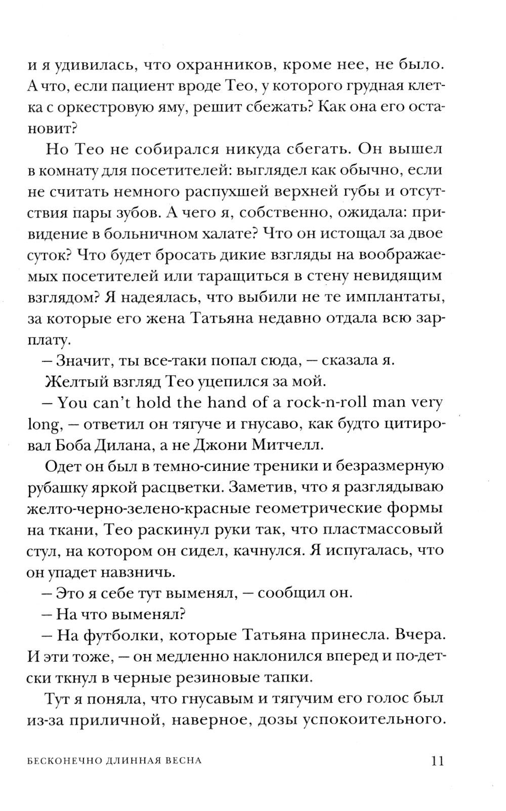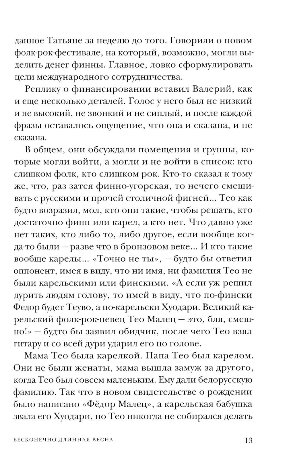 «Бесконечно длинная весна» - писательский дебют Лиды Стародубцевой, цикл карельских рассказов, в которых автор рисует портреты молодых женщин. В поисках своего места в жизни они как будто фиксируют происходящее, прислушиваются к своим ощущениям, не чувствуя ни боли, ни радости, ни страха, наблюдают за собой со стороны. Вместе истории образуют единое пространство, в котором новое оборачивается древним, одна жизнь отражается эхом в другой - и течение это никогда не прерывается.