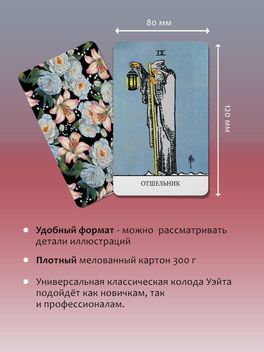Гуляйте по закоулкам судьбы без ограничений! Классическое Таро Уэйта поможет вам погрузиться в мир неизведанного. Главная особенность колоды - полное отсутствие рамок. Каждая карта обладает магической энергией. Отсутствие рамок облегчает процесс расклада, так как карты могут визуально и энергетически "перетекать" одна в другую, что способствует более целостной и точной интерпретации расклада. Это делает гадание более эффективным, усиливает связь между картами и их положениями в раскладе. Соедините карты и прочитайте историю, которую они вам рассказывают. Узнайте, что ждет вас в любви, финансах и здоровье. Небольшая и лаконичная инструкция поможет вам лучше трактовать значения карт и точнее определять, что приготовила для вас судьба. В колоде 78 карт с классическими иллюстрациями от Памелы Смит и краткая инструкция. Небольшой формат позволяет всегда брать их с собой. Колода издается в другом оформлении в малой коробке с инструкцией - под названием "Неограниченное Таро Уэйта. Карты без рамок. Энергия без границ", а также в большой коробке с подробным руководством - "Таро Уэйта без границ. Классические карты без рамок".| Издательство | Издательство "АСТ" |