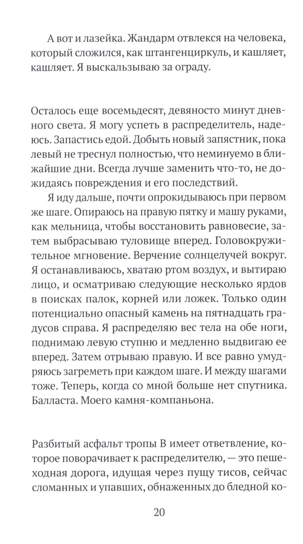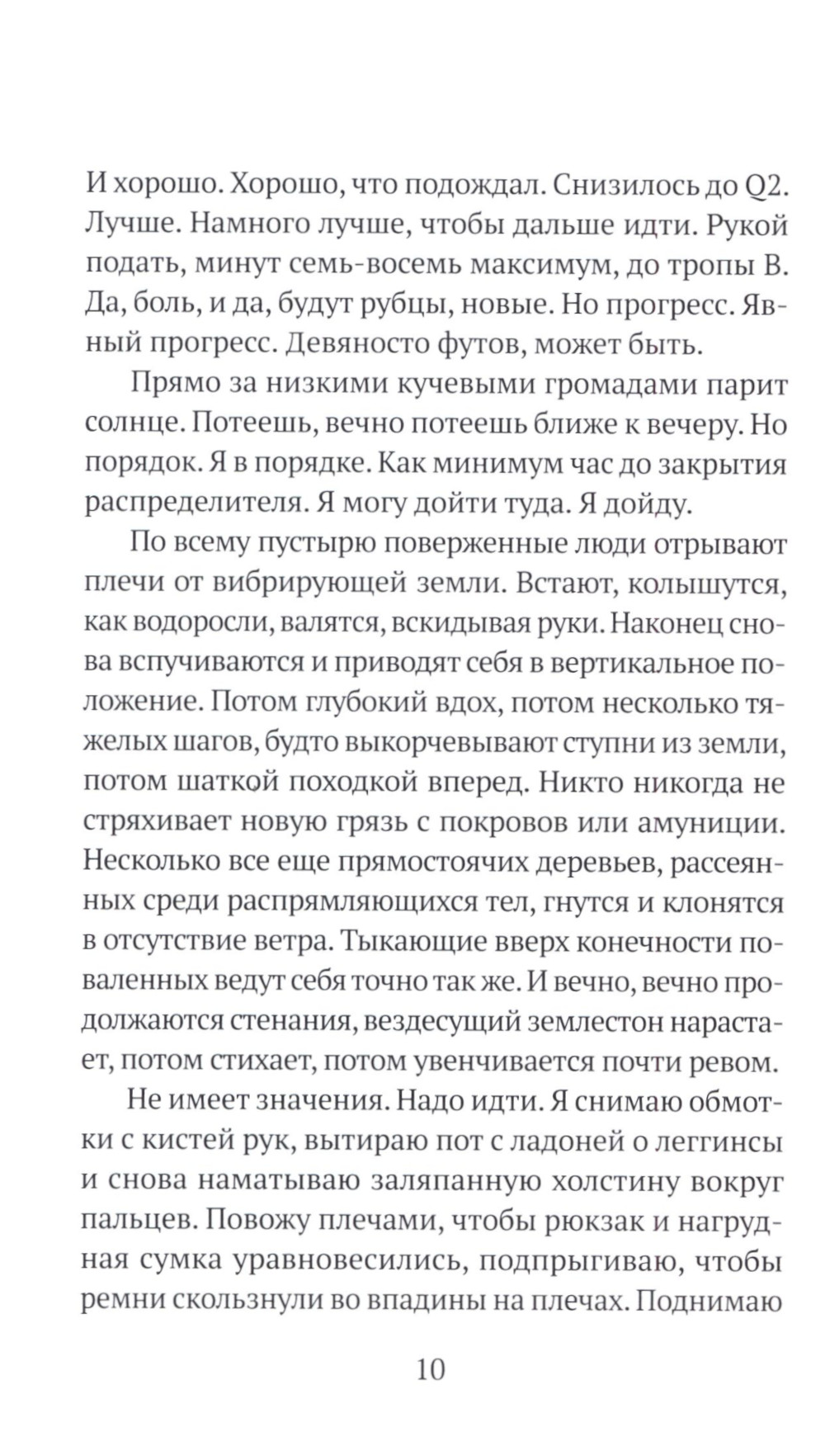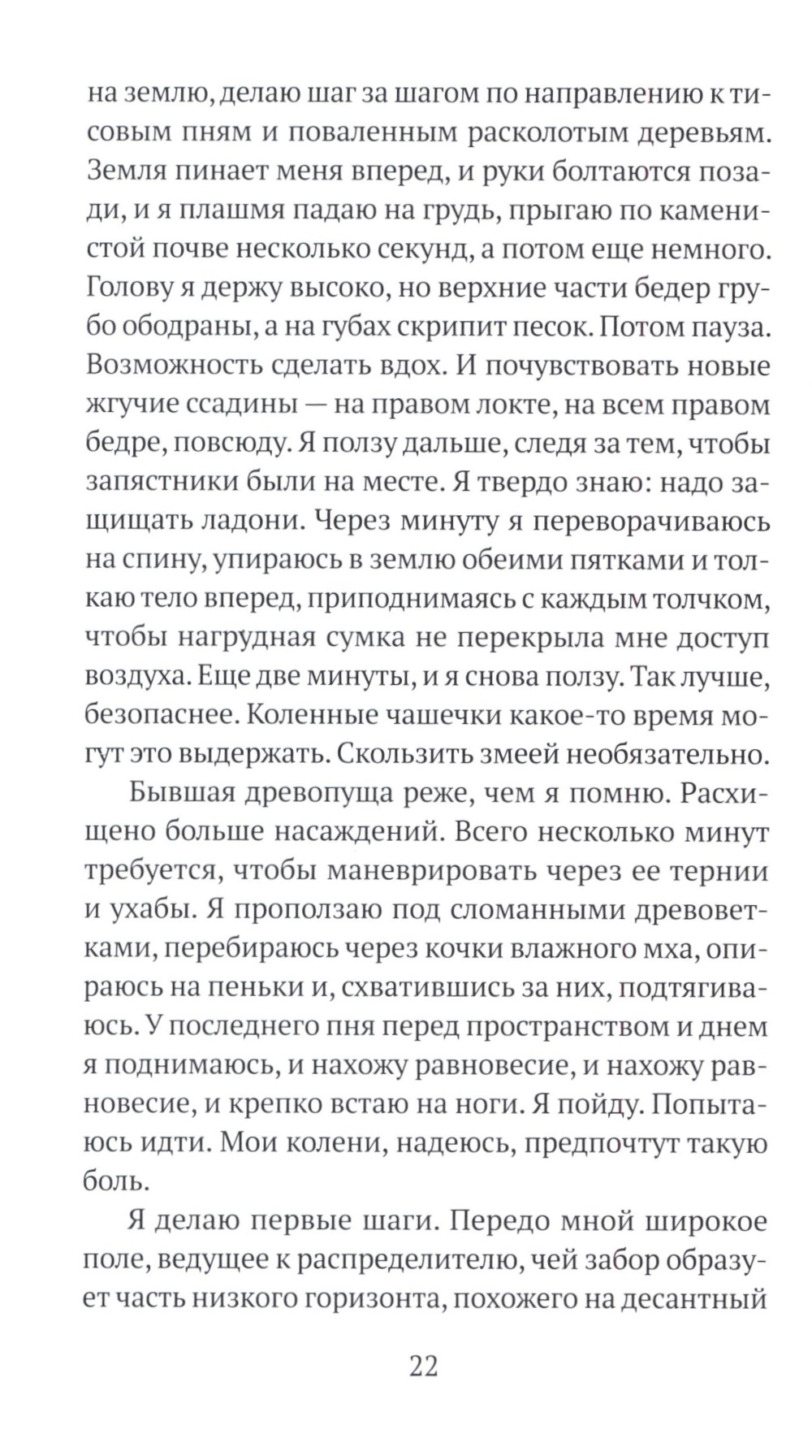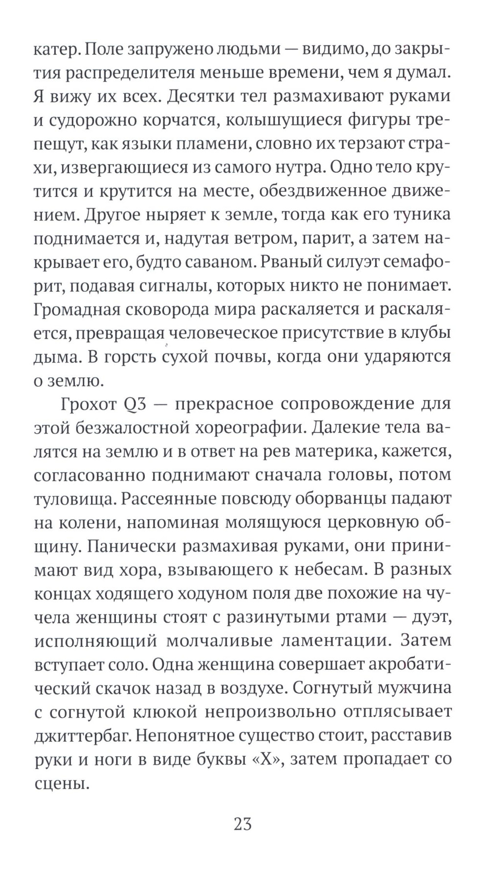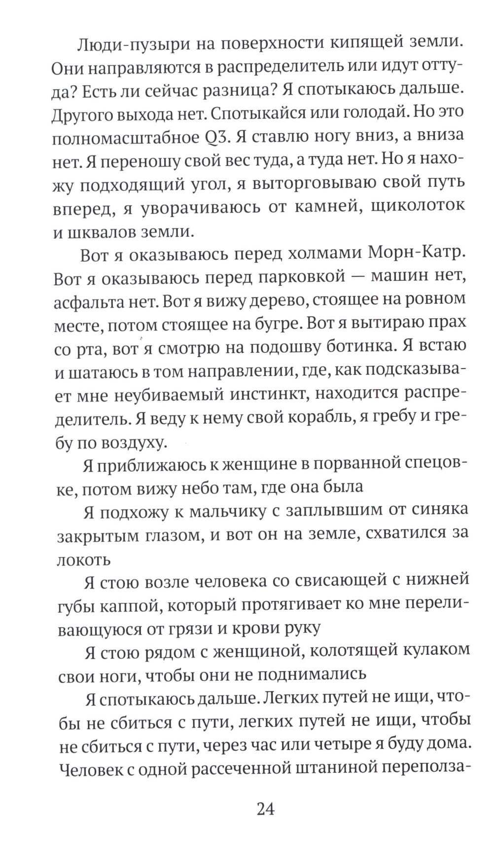 Роман Эвана Дары, известного своими стилистическими экспериментами, погружает читателя в мир локального апокалипсиса. На неком острове происходит стихийное бедствие - начавшееся однажды землетрясение никогда не заканчивается. Бежать с острова невозможно, и люди вынуждены привыкать к новой реальности. Глазами юного героя, который отчаянно силится выжить, изображен бесконечно содрогающийся мир, где не только разрушены все достижения цивилизации и привычные социальные связи, но и утеряна способность к связной речи. Однако точно ли перед нами картины жизни после катаклизма? Падение на каждом шагу, необходимость ворочать массивные камни, чтобы прокормиться, блуждания в лесу, стремление добыть карту и найти оазис устойчивости. Бесконечно меняющаяся действительность диктует человеку свои жестокие условия, но зыбкий проблеск надежды и несгибаемое упорство побуждают раз за разом вставать и продолжать путь.| Издательство | Поляндрия NoAge |