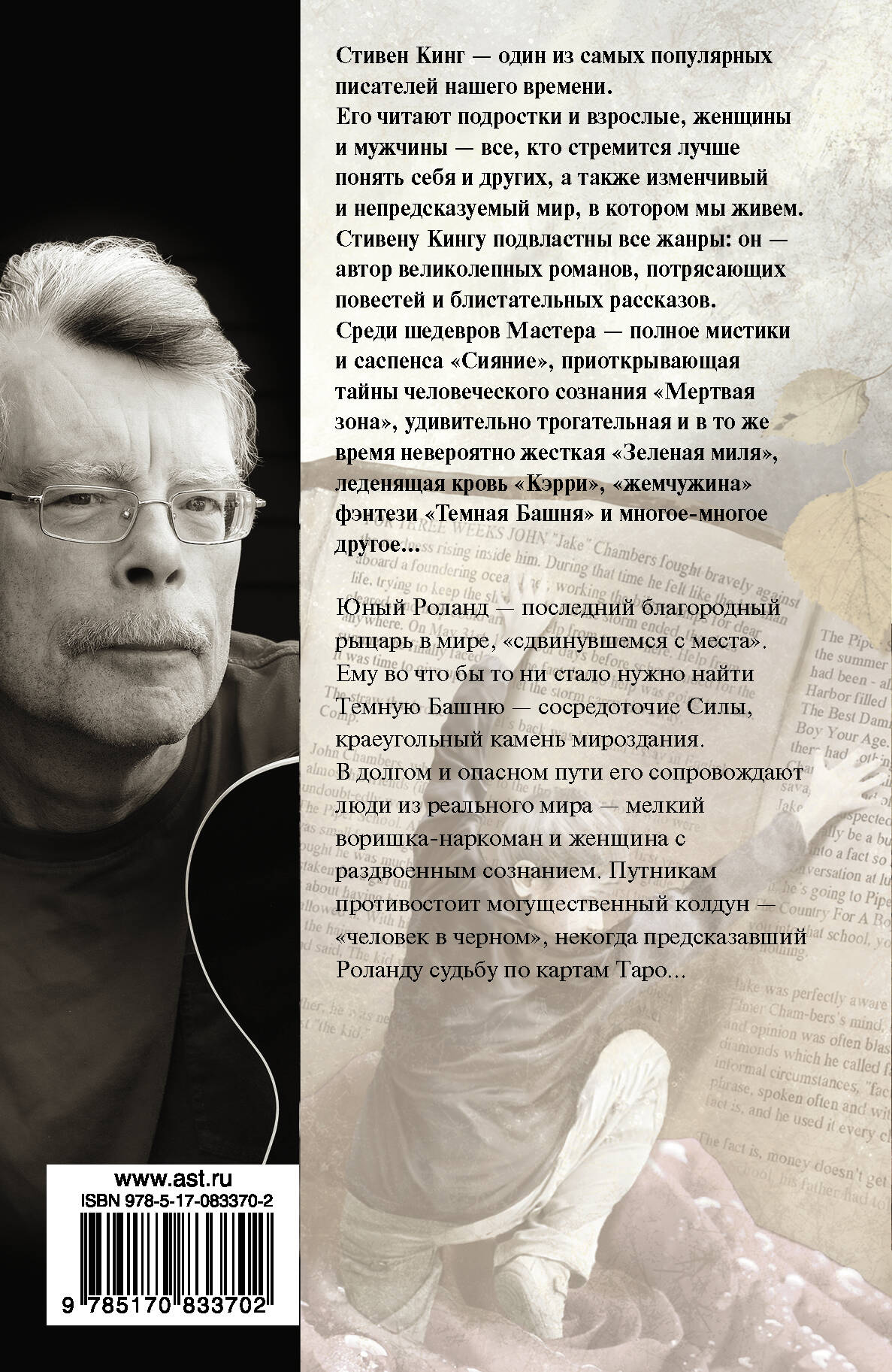 Стивен Кинг… "Король ужасов"? Да. Непревзойденный мастер проникновения в самые тайные, самые страшные, самые мрачные уголки человеческой души? Да! Жестокий, яростный и агрессивный эстет тьмы, чьи книги пугают и восхищают, возмущают - и все-таки привлекают? О да! ...Каждый из нас - лишь человек, стоящий над черной, адовой бездной собственных страхов. И только Стивен Кинг - великий Стивен Кинг! - может заставить нас шагнуть в эту бездну… Юный Роланд - последний благородный рыцарь в мире, "сдвинувшемся с места". Ему во что бы то ни стало нужно найти Темную Башню - средоточие Силы, краеугольный камень мироздания. В долгом и опасном пути его сопровождают люди из реального мира - мелкий воришка-наркоман и женщина с раздвоенным сознанием. Путникам противостоит могущественный колдун - "человек в черном", некогда предсказавший Роланду судьбу по картам Таро...