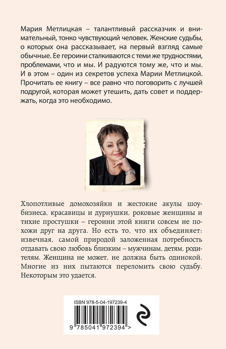 Один из самых известных сборников Марии Метлицкой. Книга, которая любима многими читателями. Хлопотливые домохозяйки и жестокие акулы шоу-бизнеса, красавицы и дурнушки, роковые женщины и тихие простушки - героини этой книги совсем не похожи друг на друга. Но есть то, что их объединяет: извечная, самой природой заложенная потребность отдавать свою любовь близким - мужчинам, детям, родителям. Женщина не может, не должна быть одинокой. Многие из них пытаются переломить свою судьбу. Некоторым это удается.| Издательство | ООО "Издательство "Эксмо" |