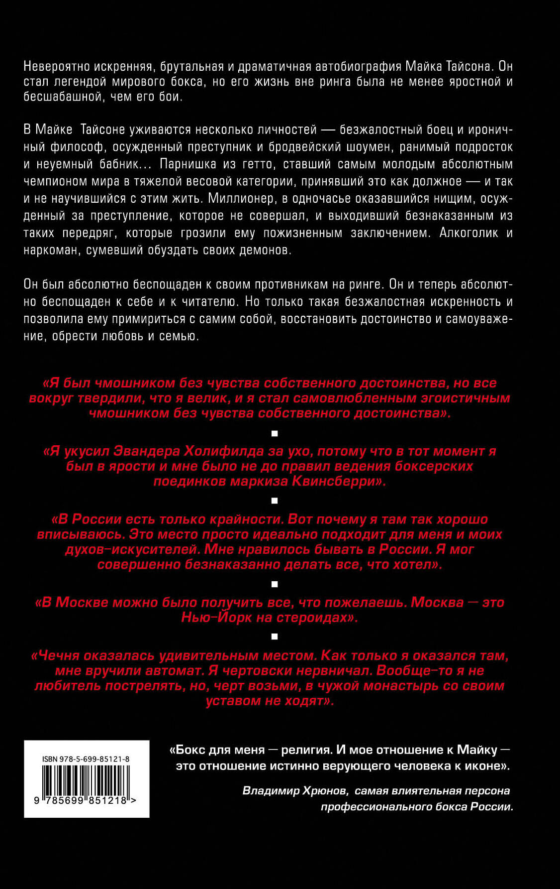 МИРОВОЙ БЕСТСЕЛЛЕР! Невероятно искренняя, брутальная и драматичная автобиография Майка Тайсона. Он стал легендой мирового бокса, но его жизнь вне ринга была не менее яростной и бесшабашной, чем его бои. В Майке Тайсоне уживаются несколько личностей - безжалостный боец и ироничный философ, осужденный преступник и бродвейский шоумен, ранимый подросток и неуемный бабник… Парнишка из гетто, ставший самым молодым абсолютным чемпионом мира в тяжелой весовой категории, принявший это как должное - и так и не научившийся с этим жить. Миллионер, в одночасье оказавшийся нищим, осужденный за преступление, которое не совершал, и выходивший безнаказанным из таких передряг, которые грозили ему пожизненным заключением. Алкоголик и наркоман, сумевший обуздать своих демонов. Он был абсолютно беспощаден к своим противникам на ринге. Он и теперь абсолютно беспощаден к себе и к читателю. Но только такая безжалостная искренность и позволила ему примириться с самим собой, восстановить достоинство и самоуважение, обрести любовь и семью. «Некоторые части "Беспощадной истины" похожи на сцены из фильмов Тарантино, происходящие в реальной жизни. Другие - словно экскурсия по самым разным мирам: от бруклинских трущоб до светской жизни Лас-Вегаса и тюремной изоляции... На каждой странице звучит неповторимый голос Майка Тайсона: не только причудливая смесь из уличной брани и лексикона программы реабилитации зависимых, но также и кинематографические описания боксерских боев, философские размышления, едкий юмор и многочисленные литературные и исторические отсылки - Толстой, Ленин, Теннесси Уильямс… Подлинное усилие мятежной души - так рассказать о своем нелегком и причудливом пути длиною в жизнь». - Митико Какутани, The New York Times «Толстенная биография, которая, возможно, станет самой откровенной книгой в своем жанре. Захватывающая, грубая, местами даже непристойная - и в то же время очень смешная». - Associated Press| Издательство | ООО "Издательство "Эксмо" |