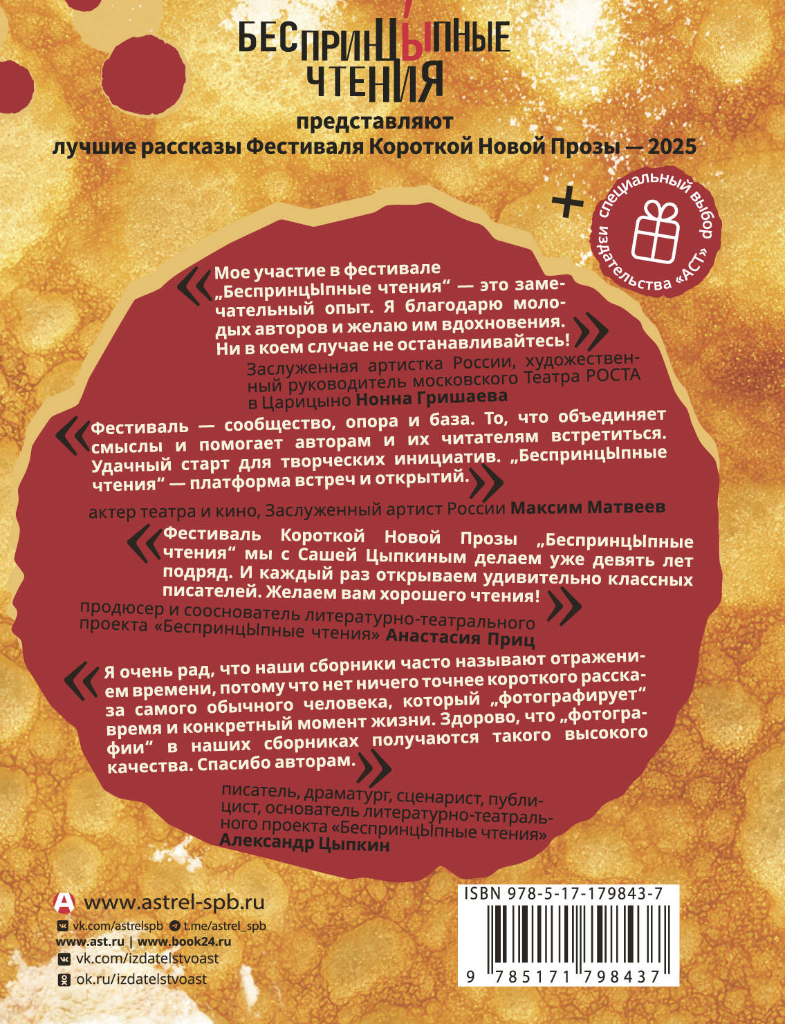 В 6-й сборник, подготовленный импринтом "Астрель-СПб" и литературно-театральным проектом "БеспринцЫпные чтения", по традиции включены лучшие короткие истории, вышедшие в финал конкурсного отбора Фестиваля Короткой Новой Прозы в 2025 году: - рассказы, которые были прочитаны со сцены популярными актерами и чтецами, одержавшими победу в специальном конкурсе проекта "БеспринцЫпные чтения"; - рассказы постоянных резидентов фестиваля: Александра Бессонова, Александра Маленкова и Александра Цыпкина; - рассказы, отмеченные редакцией. "В этом году на фестиваль пришло более двух тысяч заявок как от авторов, которые уже заявили о себе, так и от тех, кто впервые написал художественный текст. В большинстве случаев это светлые, теплые истории про любовь, дружбу, отношения с детьми или с родителями. Несколько пронзительных историй про старость - пусть они о неизбежном, но все равно с надеждой и добротой между строк. Радует, что много смешных историй, смешных по-настоящему, то есть в голос. И, наконец, самое ценное - какой красивый язык у наших авторов: богатый, изобретательный, яркий и очень родной - иными словами, солнечный, как и весь сборник, который мы и назвали в честь символа солнца. Уверен, эти истории многие будут читать вслух своим друзьям". Александр Цыпкин, основатель Фестиваля Короткой Новой Прозы "БеспринцЫпные чтения"| Издательство | Издательство "АСТ" |