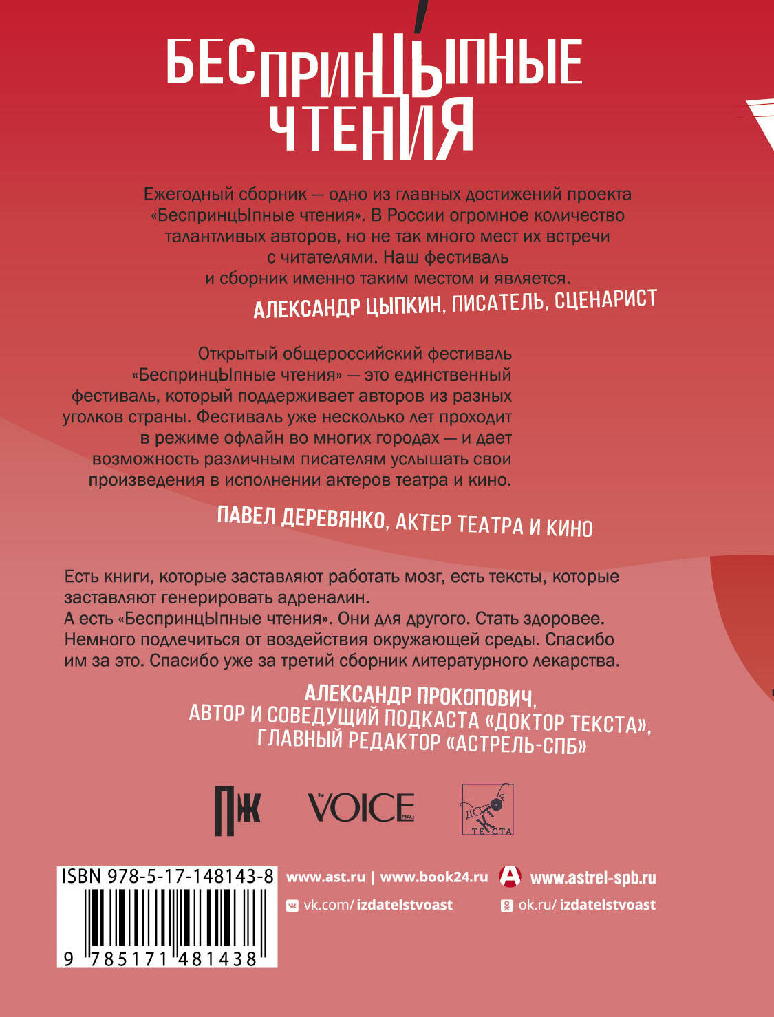 "Есть книги, которые заставляют работать мозг, есть тексты, которые заставляют генерировать адреналин. А есть "БеспринцЫпные чтения". Они для другого. Стать здоровее. Немного подлечиться от воздействия окружающей среды. Спасибо им за это. Спасибо уже за третий сборник литературного лекарства".