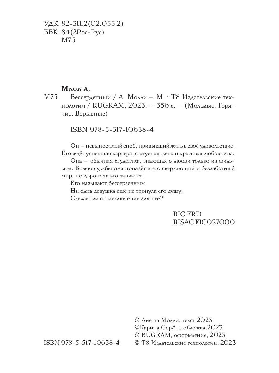 Он - невыносимый сноб, привыкший жить в своё удовольствие. Его ждёт успешная карьера, статусная жена и красивая любовница. Она - обычная студентка, знающая о любви только из фильмов. Волею судьбы она попадёт в его сверкающий и беззаботный мир, но дорого за это заплати Его называют бессердечным. Ни одна девушка ещё не тронула его душу. Сделает ли он исключение для неё?| Издательство | Т8 RUGRAM |