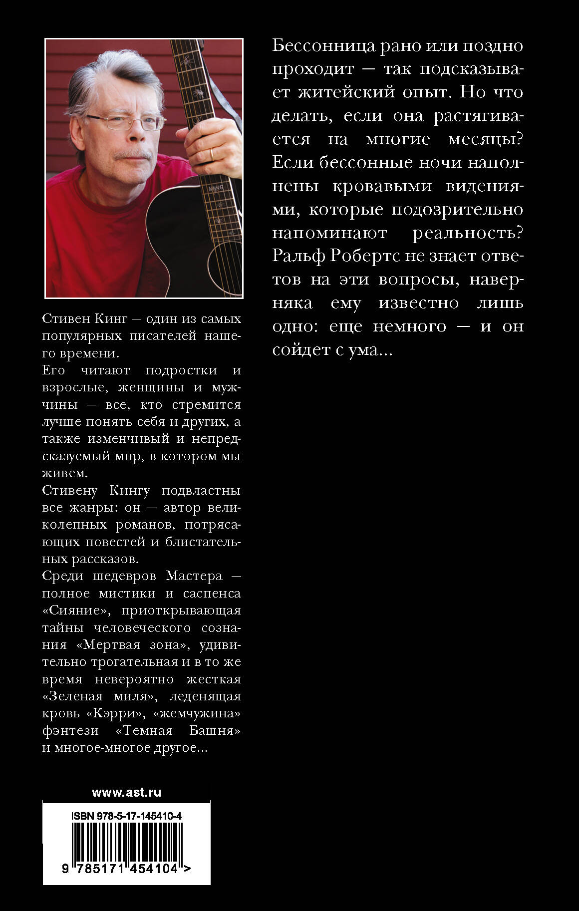 Бессонница рано или поздно проходит - так подсказывает житейский опыт. Но что делать, если она растягивается на многие месяцы? Если бессонные ночи наполнены кровавыми видениями, которые подозрительно напоминают реальность? Ральф Робертс не знает ответов на эти вопросы, наверняка ему известно лишь одно: еще немного - и он сойдет с ума...| Издательство | ИЗДАТЕЛЬСТВО "АСТ" |