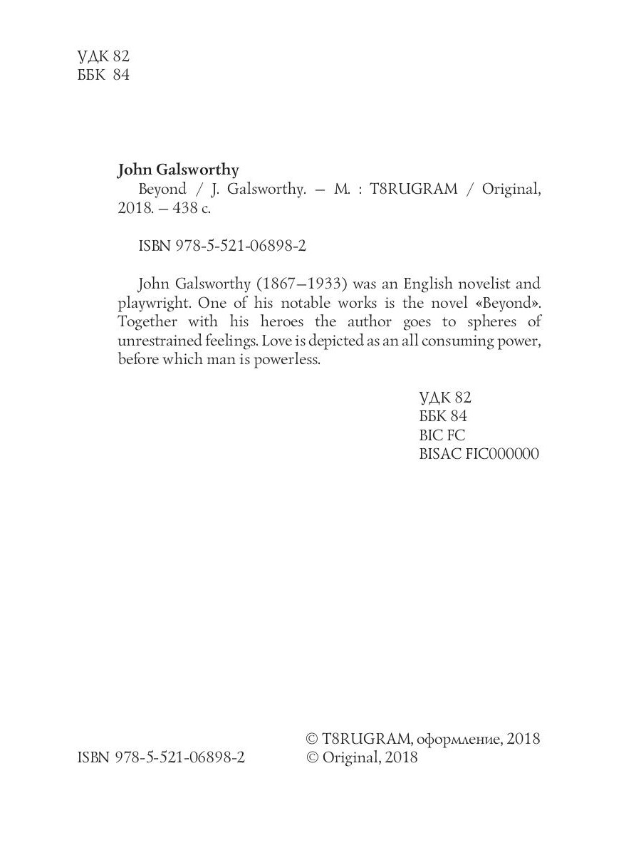 John Galsworthy (1867-1933) was an English novelist and playwright. One of his notable works is the novel «Beyond». Together with his heroes the author goes to spheres of unrestrained feelings. Love is depicted as an all consuming power, before which man is powerless.