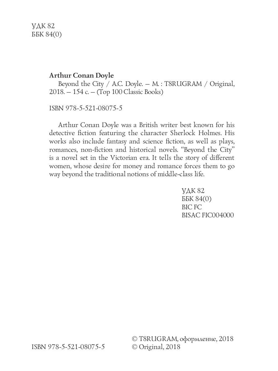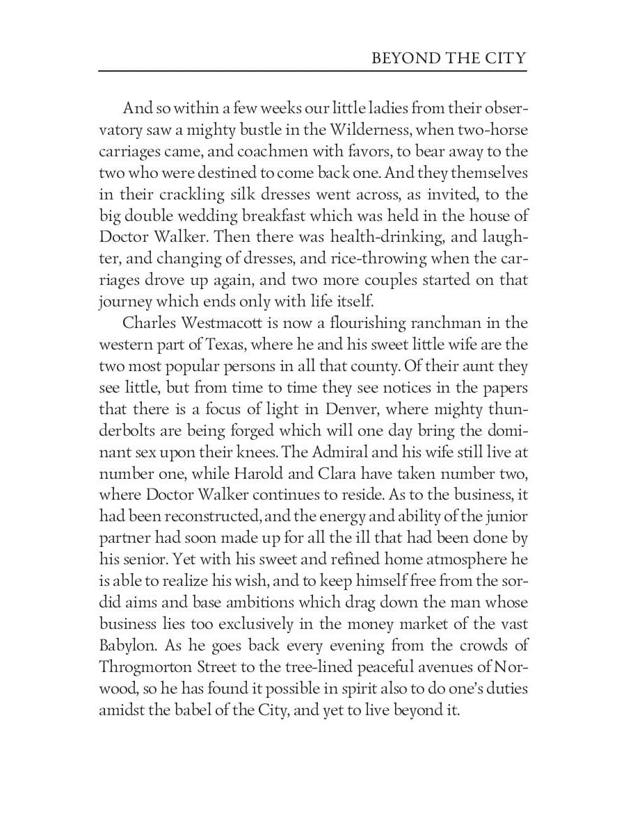 Arthur Conan Doyle was a British writer best known for his detective fiction featuring the character Sherlock Holmes. His works also include fantasy and science fiction, as well as plays, romances, non-fiction and historical novels. "Beyond the City" is a novel set in the Victorian era. It tells the story of different women, whose desire for money and romance forces them to go way beyond the traditional notions of middle-class life.