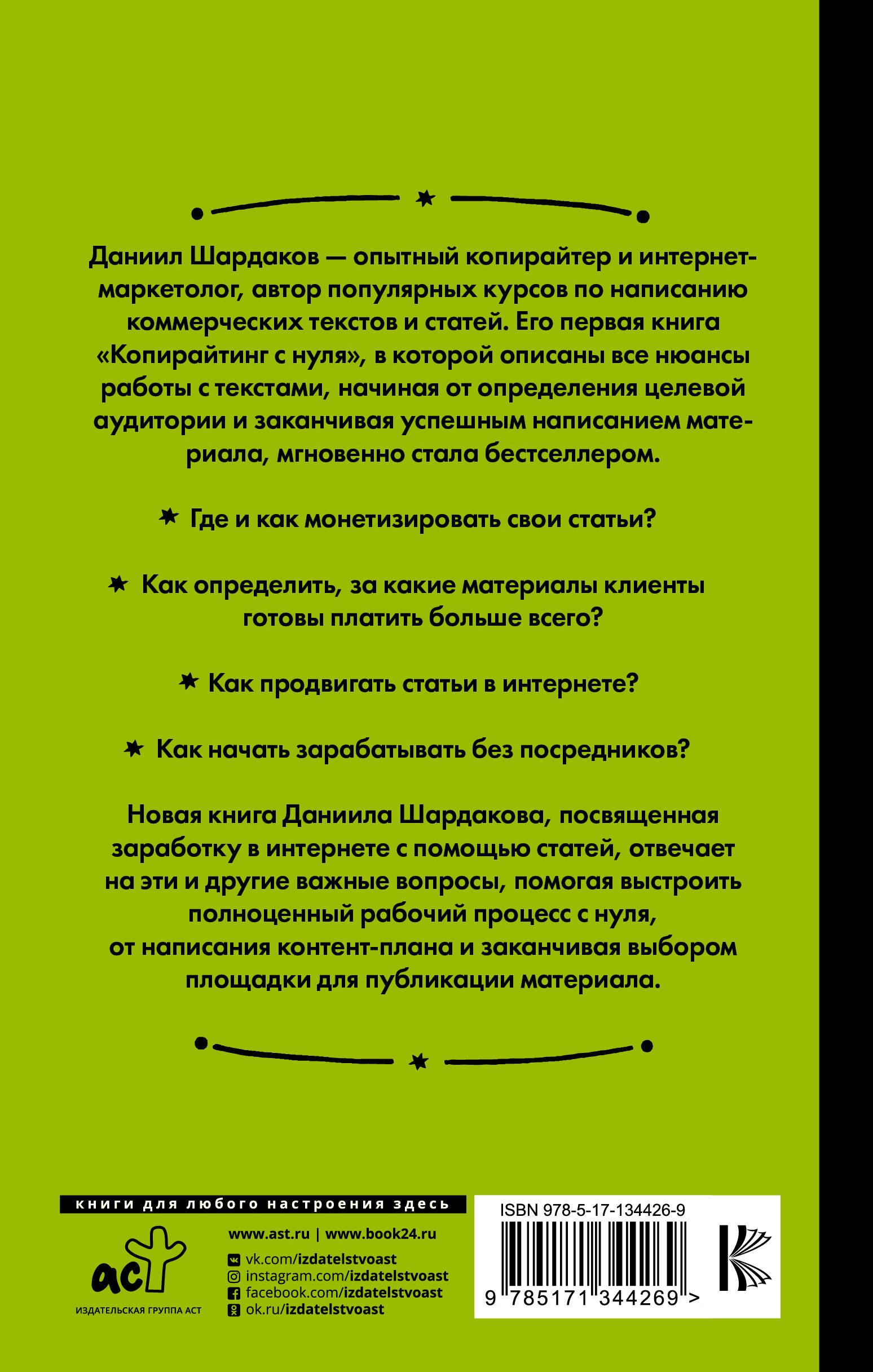 Даниил Шардаков - опытный копирайтер и интернет-маркетолог, автор популярных курсов по написанию коммерческих текстов и статей. Его первая книга "Копирайтинг с нуля", в которой описаны все нюансы работы с текстами, начиная от определения целевой аудитории и заканчивая успешным написанием материала, мгновенно стала бестселлером. Где и как монетизировать свои статьи? Как определить, за какие материалы клиенты готовы платить больше всего? Как продвигать статьи в интернете? Как начать зарабатывать без посредников? Новая книга Даниила Шардакова, посвященная заработку в интернете с помощью статей, отвечает на эти и другие важные вопросы, помогая выстроить полноценный рабочий процесс с нуля, от написания контент-плана и заканчивая выбором площадки для публикации материала.
