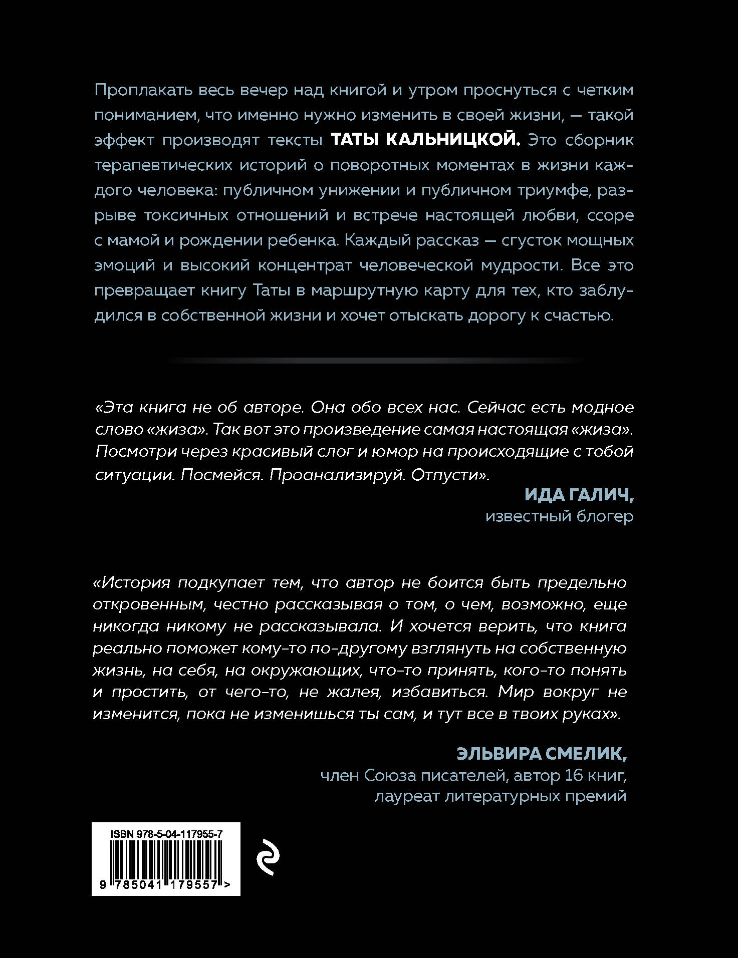 Проплакать весь вечер над книгой и утром проснуться с четким пониманием, что именно нужно изменить в своей жизни - такой эффект производят тексты Таты Кальницкой. Это сборник терапевтических историй о поворотных моментах в жизни каждого человека: публичном унижении и публичном триумфе, разрыве токсичных отношений и встрече настоящей любви, ссоре с мамой и рождении ребенка. Каждый рассказ - сгусток мощных эмоций и высокий концентрат человеческой мудрости. Все это превращает книгу Таты в маршрутную карту для тех, кто заблудился в собственной жизни и хочет отыскать дорогу к счастью. "Эта книга не об авторе. Она обо всех нас. Сейчас есть модное слово "жиза". Так вот, это произведение - самая настоящая "жиза". Посмотри через красивый слог и юмор на происходящие с тобой ситуации. Посмейся. Проанализируй. Отпусти". Ида Галич, известный блогер "История подкупает тем, что автор не боится быть предельно откровенным, честно рассказывая о том, о чем, возможно, еще никогда никому не рассказывала. И хочется верить, что книга реально поможет кому-то по-другому взглянуть на собственную жизнь, на себя, на окружающих, что-то принять, кого-то понять и простить, от чего-то, не жалея, избавиться. Мир вокруг не изменится, пока не изменишься ты сам, и тут все в твоих руках". Эльвира Смелик, Член Союза писателей, автор 16 книг| Издательство | ООО "Издательство "Эксмо" |
