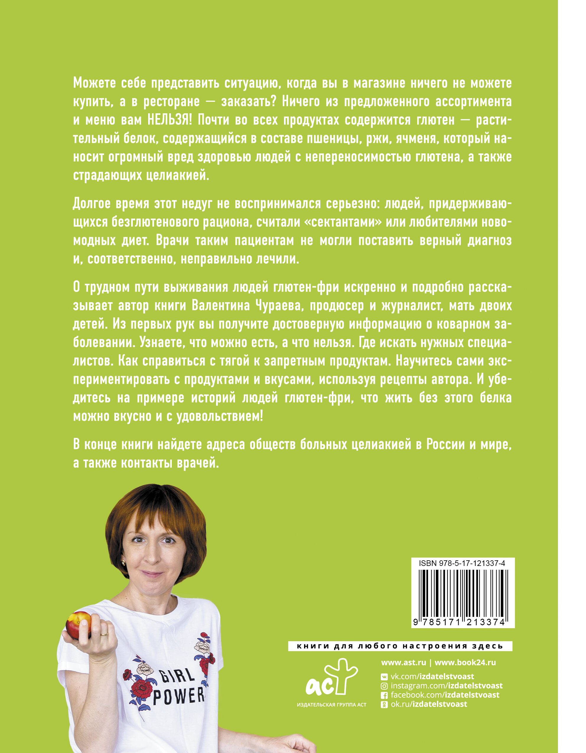 «Я объединила десятки тысяч подписчиков в своем блоге в Инстаграме (instagram.com/valentina_glutenfree/)- тех, для кого важна, а может, пока только интересна тема глютена, безглютеновой диеты и глютен-фри жизни. Именно так - глютен-фри жизни, потому что я считаю, что, когда переходишь на безглютеновую диету, жизнь становится другой: меняются привычки, и не только в еде. Трансформируется отношение к себе, окружающим и к своей жизни. Человек все чаще задумывается: что важно для меня? Что делает меня счастливым? За четыре года я прошла столько этапов от неприятия болезни до осознания того, насколько моя жизнь прекрасна, интересна и наполнена, что мне хочется поделиться своим опытом с вами, рассказать истории людей, которые помогли мне понять причину непереносимости глютена и научили вести новый, здоровый и счастливый безглютеновый образ жизни».| Издательство | ИЗДАТЕЛЬСТВО "АСТ" |
