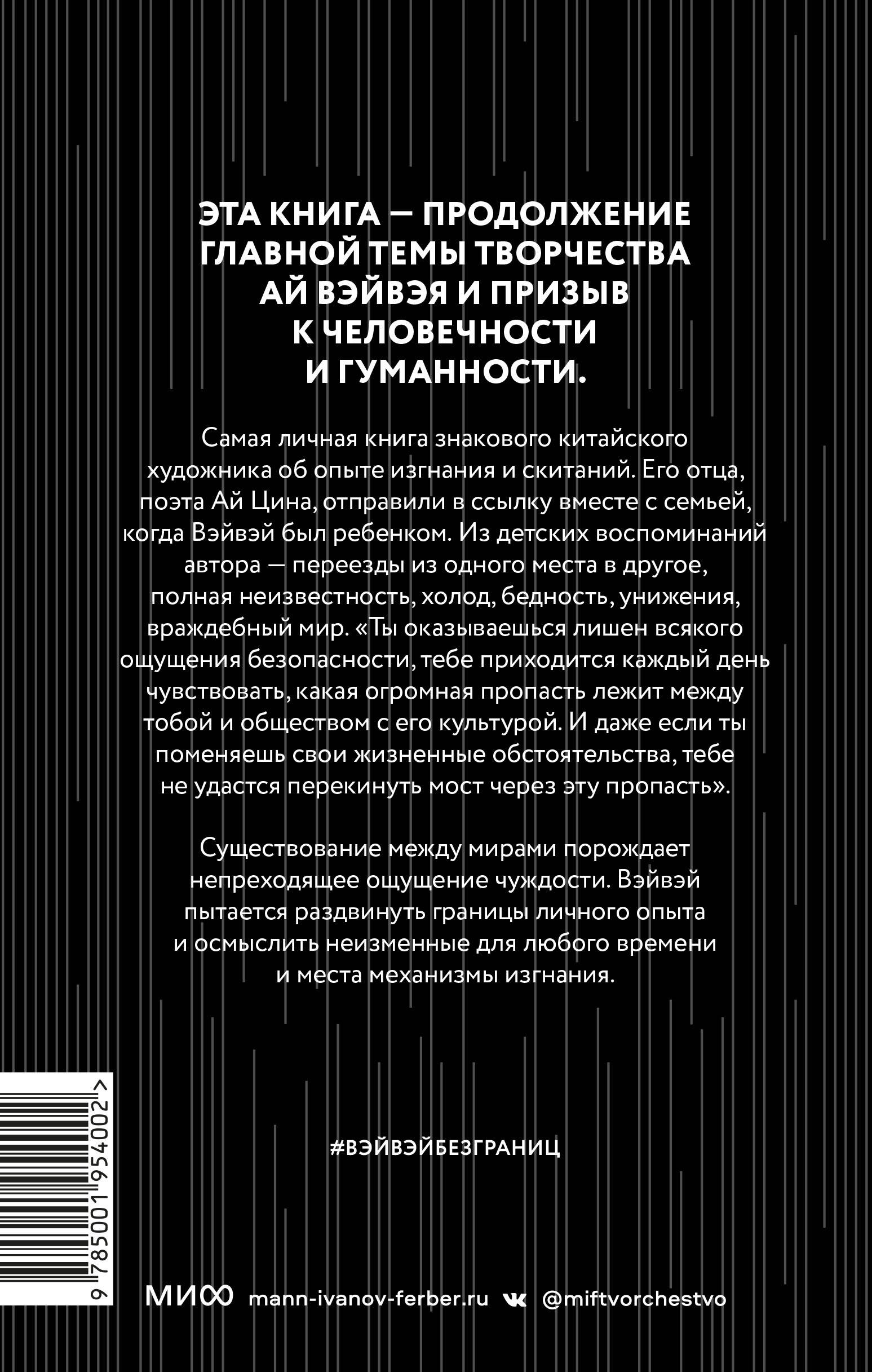 Самая личная книга Ай Вэйвэя об отчуждении, границах и чувстве изгоя. Работы известного художника и активиста Ай Вэйвэя можно найти в общественных местах бесчисленного количества стран, а известные музеи яростно соревнуются за его артефакты. Но кто стоит за международным лейблом Ai Weiwei? Ай Вэйвэй вырос в Маньчжурии и Синьцзяне, куда был сослан его отец - китайский поэт и критик режима Ай Цин. Ай переехал в США, но был вынужден вернуться в Пекин в 1993 году, чтобы заботиться об отце, когда тот заболел. Много позже, в 2011 году, покинуть Китай ему не разрешили и держали под стражей 81 день. Ай Вэйвэй очень рано узнал, каково это - быть чужаком. Однако через свое искусство он трансформирует опыт экзистенциальной чуждости во что-то универсальное. В 2015 году он оказался в Берлине, как раз в то время, когда в город приехали сразу 80 тысяч беженцев, что подтолкнуло его к решению посетить лагеря беженцев по всему миру и созданию фильма Human Flow ("Людской поток"). В этой книге его воспоминания становятся исповедью, выходящей далеко за рамки искусства ради искусства: в ней настойчиво слышен призыв к мирному общению, дружелюбию и человечности, так сейчас необходимыми. "Без границ" - книга о существовании между мирами, непреходящем чувстве чуждости, опыте беженцев и исчезающей человечности. Для кого эта книга: Для всех, кто интересуется современным искусством и активизмом.| Издательство | МАНН, ИВАНОВ И ФЕРБЕР ООО |