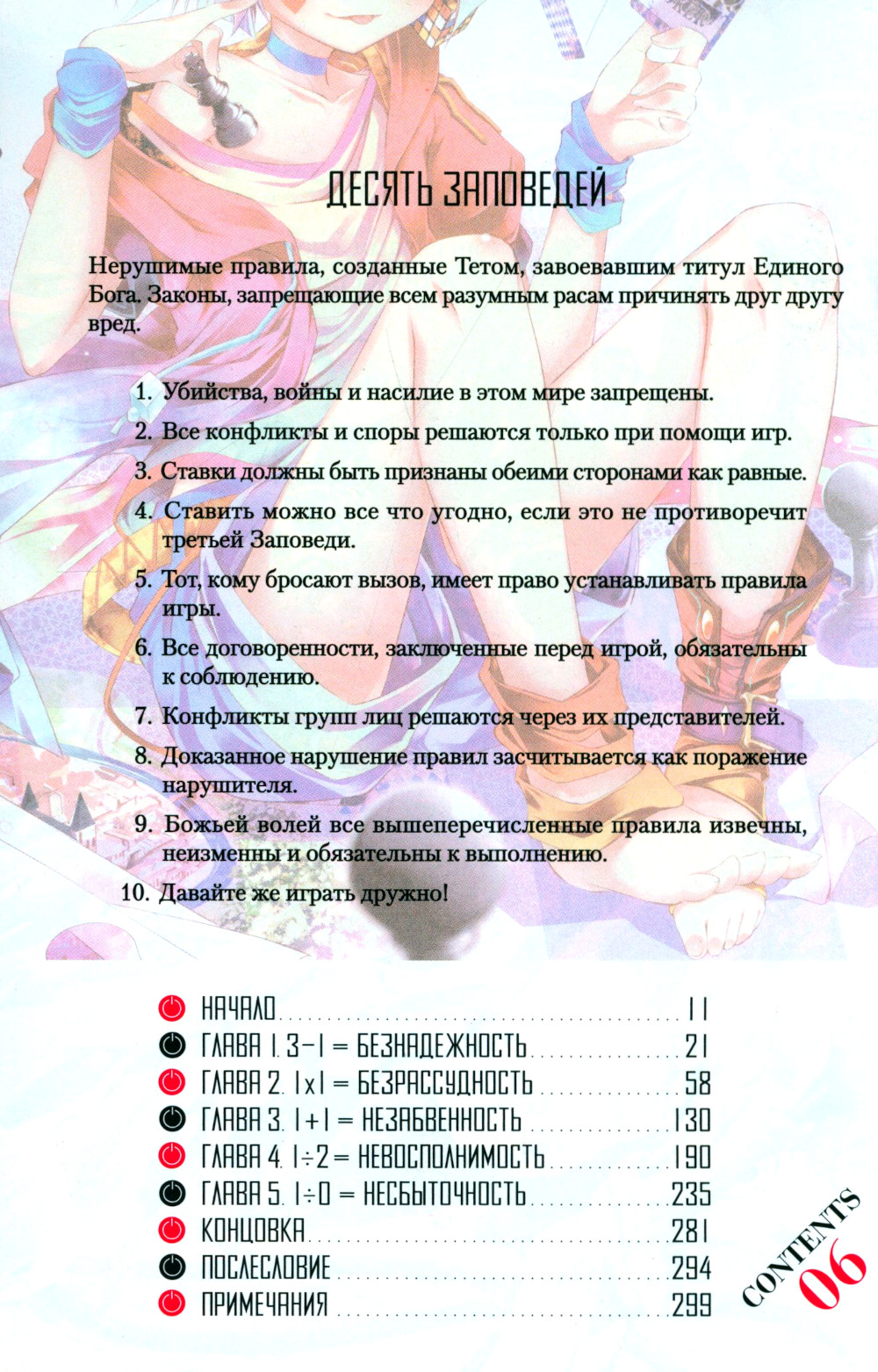 За несколько тысяч лет до того, как Сора и Сиро попали в Дисборд и началась легенда, известная всем, имела и место другая легенда - всеми забытая. Это история о великой войне, которая длилась испокон веков, о том, как выжженную землю удобряла кровь, а с багровых небес, не прекращая, падал пепел. О том, как слабы и беспомощны были люди, которые даже не надеялись на счастье и пытались просто выжить, чтобы хотя бы их потомки когда-нибудь увидели что-то кроме этой войны. И о мужчине и девушке, которые захотели положить ей конец и бросили вызов всему миру, решив считать происходящее просто игрой. Правдива эта история или нет? А так ли это важно?| Издательство | ЭксЭл Медиа |