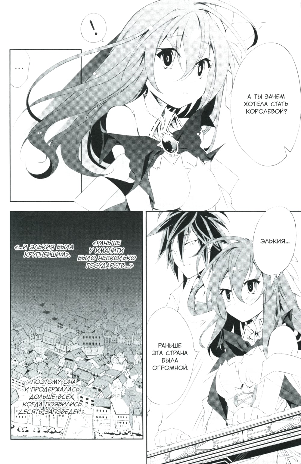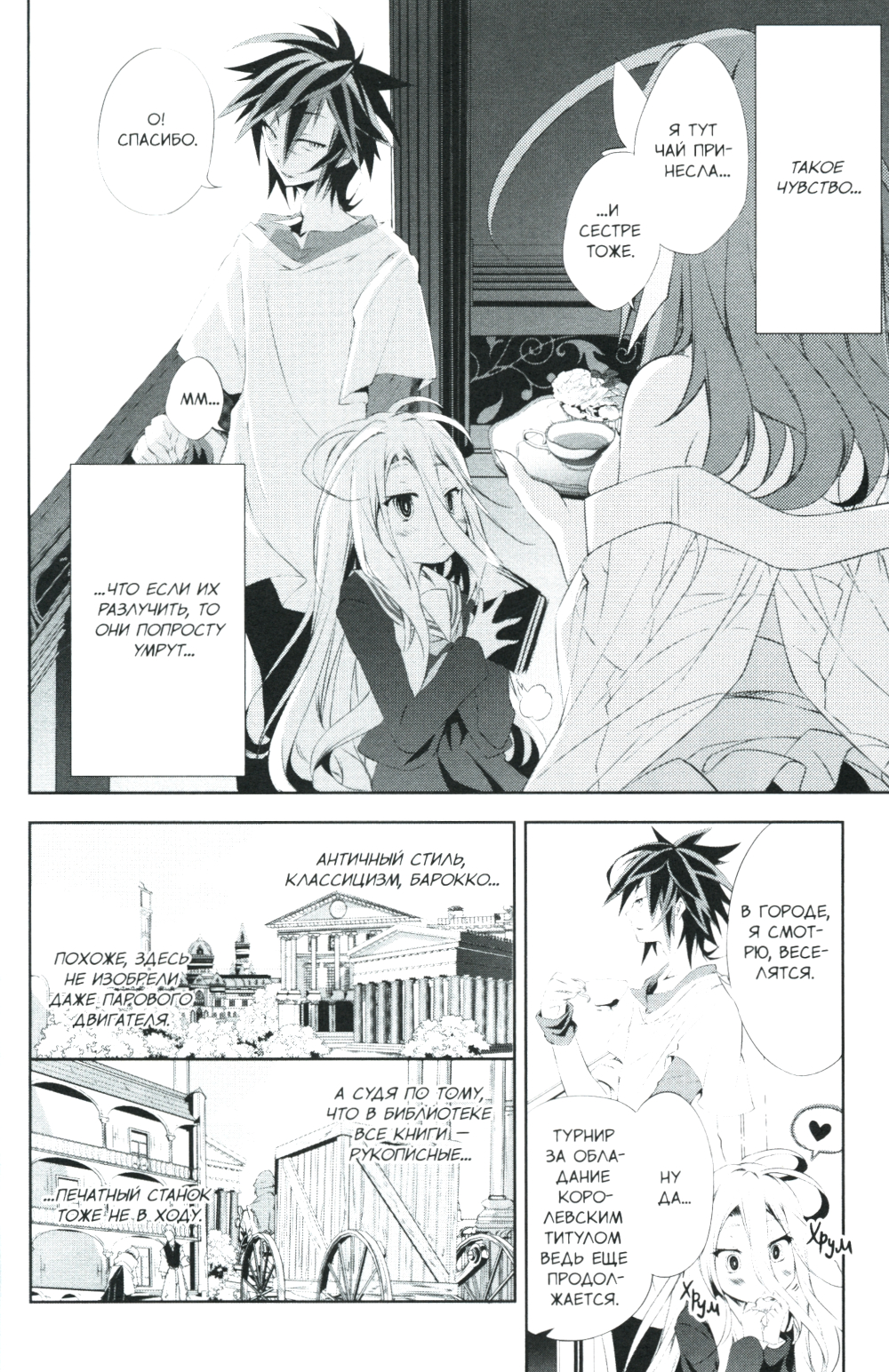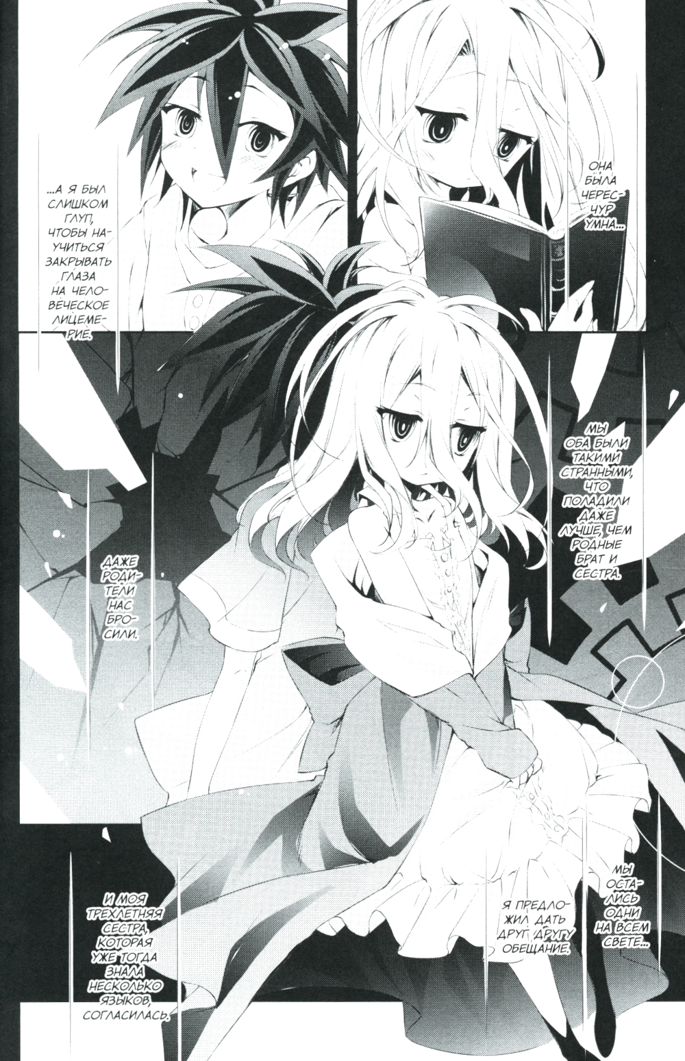 Однажды незнакомец, называющий себя богом, предлагает Соре и Сиро, парочке заядлых геймеров, отправиться в другой мир, где все конфликты решаются с помощью игр. Но обнаруживается, что человечество тут в отчаянном положении: последние оставшиеся земли людей вот-вот отойдут враждебным государствам. Брат с сестрой решают принять участие в турнире, приз в котором - королевский титул. Им предстоит сразиться с очень опасной противницей - таинственной Кламми Целл, которая использует эльфийскую магию... Смогут ли они стать спасителями человечества в чужом мире?| Издательство | ЭксЭл Медиа |