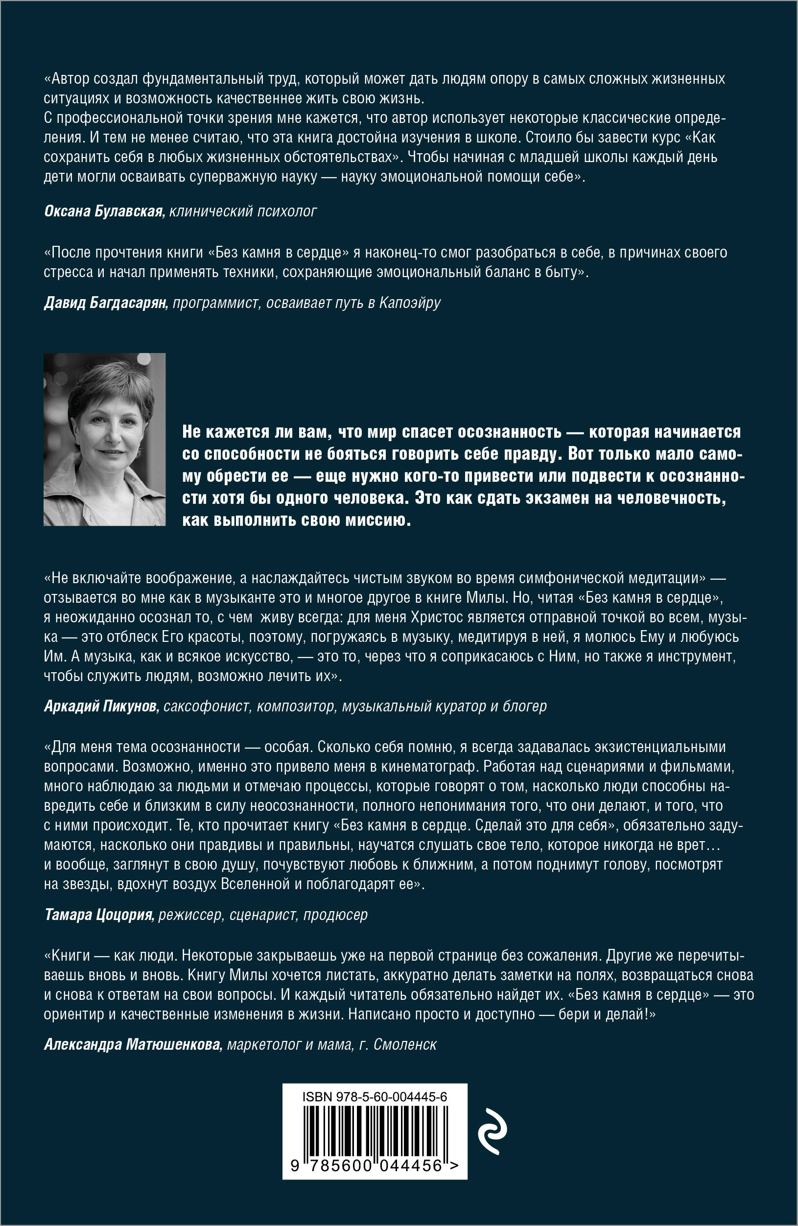 Замечали такое: купили то, что давно хотели, или получили должность мечты, а счастья при этом не чувствуете? Словно что-то мешает. Умом понимаете, как это здорово, но радоваться не можете. Чаще всего так получается потому, что в момент получения желаемого мы не смакуем обретение, а тут же думаем о том, что нужно еще. Когда мы занимаемся саморазвитием без самопознания, мы выбираем «казаться» вместо того, чтобы «быть». Прочитав эту книгу и выполнив практики, вы начнете понимать свои истинные намерения и желания, научитесь быть честным с собой. Здесь мы учимся не достигаторству, а состоянию присутствия. Получив желаемое, важно прожить радость от достигнутого, а не сразу переключаться на следующую цель. Зачем достигать, если не побывал на седьмом небе от полученного? Благодаря этой книге вы: • Проникнете в тайны своих иллюзий, обид и бессознательных программ. • Избавитесь от тяжелых чувств, не меняя отношения к тому, что произошло. • Узнаете, что повышает нашу эффективность в работе и в отношениях. • Поймете, как сохранить свои границы и не посягать на чужие. • Увеличите чувство удовольствия и наслаждения от жизни. «Как читатель я подхожу к книжному развалу, открываю книгу наугад и нахожу то, с чем не согласна, и то, что мне нужно. О первом размышляю, второе - применяю. И свою книгу я написала в том же ключе - вы точно встретите здесь то, что вам необходимо, и то, с чем вы не согласны». ОТЗЫВЫ: «Автор создал фундаментальный труд, который может дать людям опору в самых сложных жизненных ситуациях и возможность качественнее жить свою жизнь. С профессиональной точки зрения мне кажется, что автор использует некоторые классические определения. И тем не менее считаю, что эта книга достойна изучения в школе. Стоило бы завести курс - как сохранить себя в любых жизненных обстоятельствах. Чтобы, начиная с младшей школы, каждый день дети могли осваивать суперважную науку - науку эмоциональной помощи себе». - Булавская Оксана, клинический психолог «"Без камня на сердце" - для меня приводит в баланс мир чувственный и логический. Книга о поиске внутренней устойчивой связи с самим собой, со своей интуицией, мечтами, чувствами, желаниями, целями». - Почетова Анна Александровна, солистка оркестра, автор пособия «Секреты флейты», преподаватель флейты муз. колледжа г. Калуга «Эта книга как конфета. Крайние главы обертка, а центральные самые вкусные и полезные: практики, инсайты. Понравились больше всего. Но вкусить начинку можно только развернув фантик - прочесть первые главы. Цельная книга, как стать цельной личностью». - Александр Горбачев, эксперт по тайм-менеджменту, преподаватель, algorbachev.ru «После прочтения книги "Без камня на сердце" я наконец-то смог разобраться в себе, в причинах своего стресса, и начал применять техники, сохраняющие эмоциональный баланс в быту». - Давид Б. программист, осваивает путь в Капоэйру «"Не включайте воображение, а наслаждайтесь чистым звуком во время симфонической медитации" - отзывается во мне как в музыканте это и многое в книге Милы. Но читая "Потребность в ясном убеждении", я неожиданно осознал то, с чем живу всегда - для меня Христос является отправной точкой во всем, музыка - это отблеск Его красоты, поэтому, погружаясь в музыку, медитируя в ней, я молюсь Ему и любуюсь Им. А музыка, как и искусство, это то, через что я соприкасаюсь с Ни