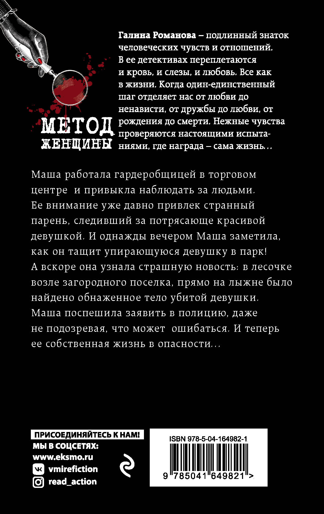 Маша работала гардеробщицей в торговом центре и привыкла наблюдать за людьми. Ее внимание уже давно привлек странный парень, следивший за потрясающе красивой девушкой. И однажды вечером Маша заметила, как он тащит упирающуюся девушку в парк! А вскоре она узнала страшную новость: в лесочке возле загородного поселка прямо на лыжне было найдено обнаженное тело убитой девушки. Маша поспешила заявить в полицию, даже не подозревая, что может ошибаться. И теперь ее собственная жизнь в опасности… Сложно было представить, что авантюрная идея изложить на бумаге придуманную криминальную историю внезапно перерастет во что-то серьезное и станет смыслом жизни. Именно с этого начался творческий путь российской писательницы Галины Романовой. И сейчас она по праву считается подлинным знатоком чувств и отношений. Суммарный тираж книг Галины Романовой превысил 3 миллиона экземпляров.