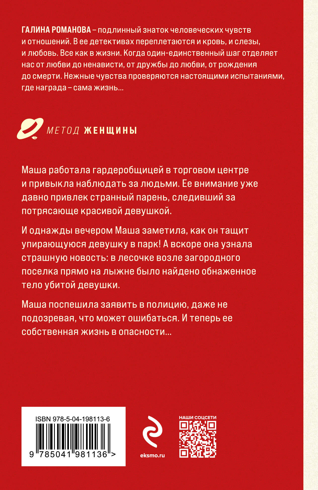 Маша работала гардеробщицей в торговом центре и привыкла наблюдать за людьми. Ее внимание уже давно привлек странный парень, следивший за потрясающе красивой девушкой. И однажды вечером Маша заметила, как он тащит упирающуюся девушку в парк! А вскоре она узнала страшную новость: в лесочке возле загородного поселка прямо на лыжне было найдено обнаженное тело убитой девушки. Маша поспешила заявить в полицию, даже не подозревая, что может ошибаться. И теперь ее собственная жизнь в опасности… Сложно было представить, что авантюрная идея изложить на бумаге придуманную криминальную историю внезапно перерастет во что-то серьезное и станет смыслом жизни. Именно с этого начался творческий путь российской писательницы Галины Романовой. И сейчас она по праву считается подлинным знатоком чувств и отношений. Суммарный тираж книг Галины Романовой превысил 3 миллиона экземпляров.| Издательство | ООО "Издательство "Эксмо" |