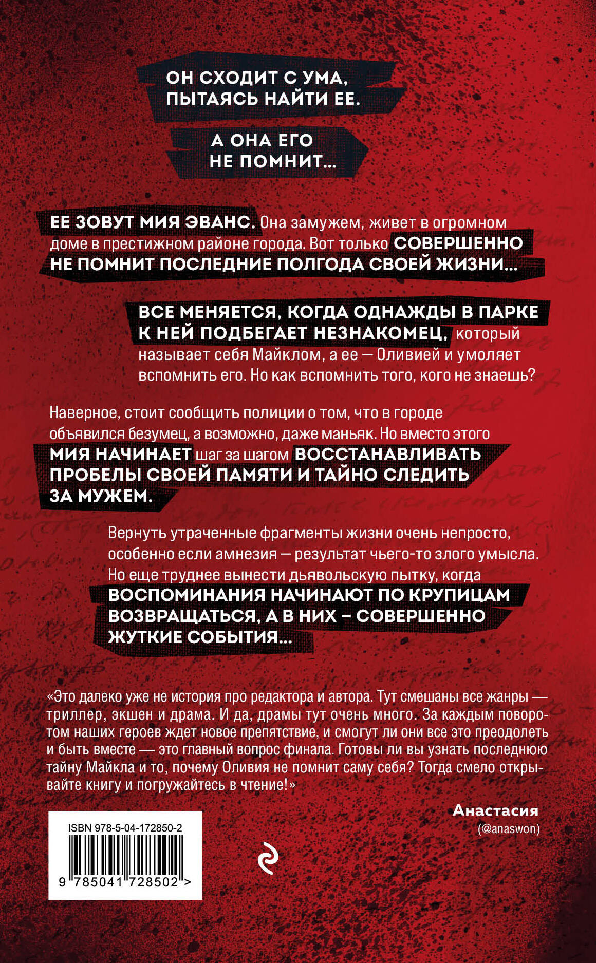 Он сходит с ума, пытаясь найти ее. А она его не помнит… Ее зовут Мия Эванс. Она замужем, живет в огромном доме в престижном районе города. Вот только совершенно не помнит последние полгода своей жизни… Все меняется, когда однажды в парке к ней подбегает незнакомец, который называет себя Майклом, а ее - Оливией, и умоляет вспомнить его. Но как вспомнить того, кого не знаешь? Наверное, стоит сообщить полиции о том, что в городе объявился безумец, а возможно, даже маньяк. Но вместо этого Мия начинает шаг за шагом восстанавливать пробелы своей памяти и тайно следить за мужем. Вернуть утраченные фрагменты жизни очень непросто, особенно если амнезия - результат чьего-то злого умысла. Но еще труднее вынести дьявольскую пытку, когда воспоминания начинают по крупицам возвращаться, а в них - совершенно жуткие события… ------------------------------ «Это далеко уже не история про редактора и автора. Тут смешаны все жанры триллера, экшена и драмы. И - да, драмы тут очень много. За каждым поворотом наших героев ждет новое препятствие, и смогут ли они все это преодолеть и быть вместе - это главный вопрос финала. Готовы ли вы узнать последнюю тайну Майкла и то, почему Оливия не помнит саму себя? Тогда смело открывайте книгу и погружайтесь в чтение!» - Анастасия (@anaswon) «На что вы готовы ради любви? Майкл согласен пройти через огонь, воду и медные трубы, чтобы спасти ту, которая смогла пробиться через стены, окружающие его сердце. И если для этого понадобится припугнуть кого-то или убить, то так тому и быть! Эта часть позволит вам иначе взглянуть на яростного, харизматичного и неудержимого главного героя, узнать его лучше и влюбиться без оглядки. Уровень напряжения растет с каждой главой, заставляя нервничать в ожидании развязки. Приготовьтесь, будет горячо, временами пугающе, но до ужаса интересно. Шквал самых разных эмоций обеспечен». - Полина (@forbooksever)| Издательство | ООО "Издательство "Эксмо" |