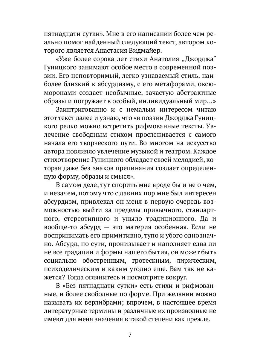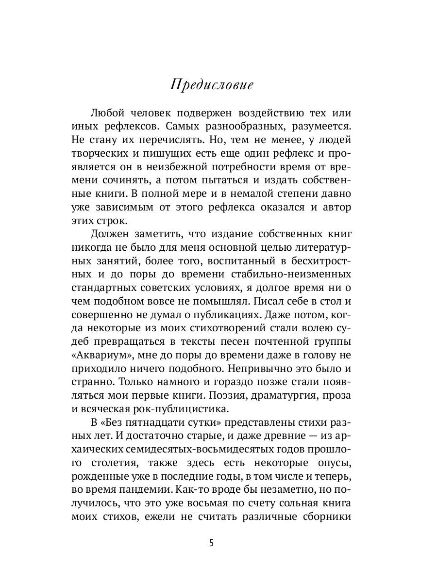 «Без пятнадцати сутки» - авторский сборник поэзии, здесь представлены стихи разных лет. И достаточно старые, и даже древние - из архаических семидесятых-восьмидесятых годов прошлого столетия. Также здесь есть некоторые опусы, рожденные уже в последние годы, в том числе и теперь, во время пандемии. Каждое стихотворение Гуницкого обладает своей мелодией, которая даже без знаков препинания создает определенную форму, образы и смысл.