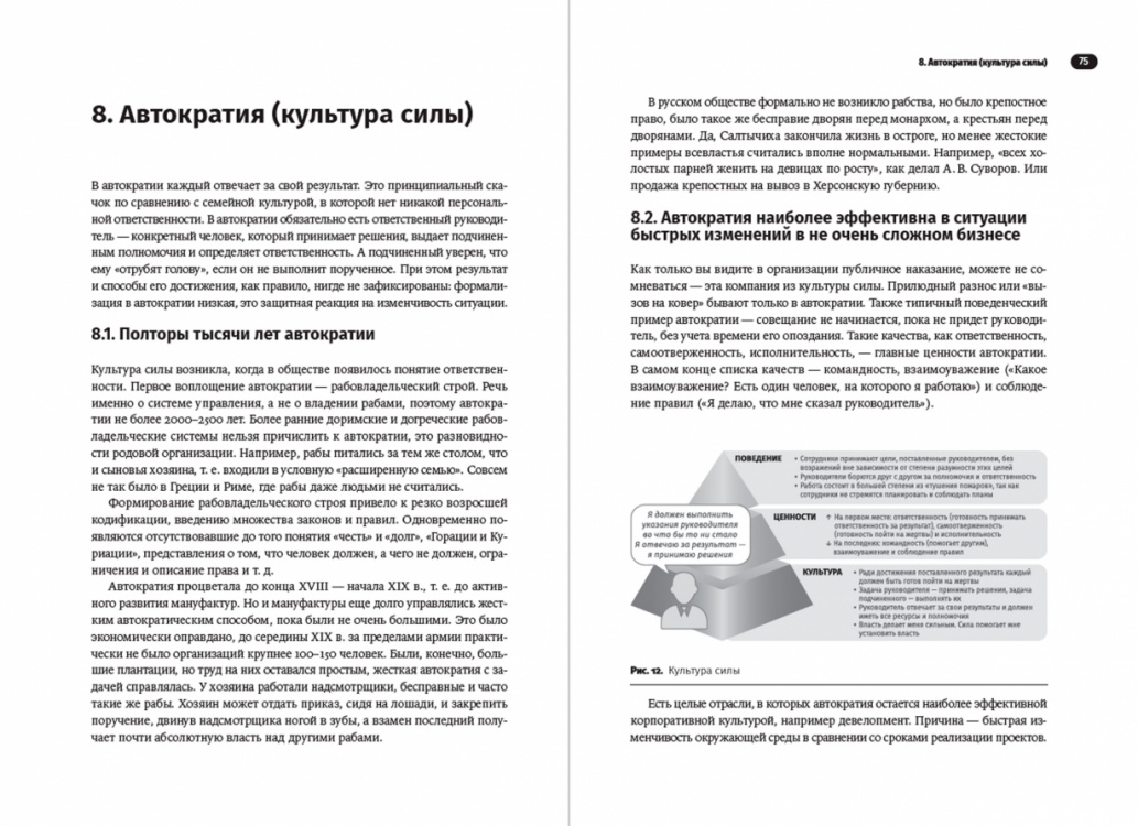 Григорий Финкельштейн рассказывает, как подобрать лучший вид управления для своей компании и совершить переход от текущей системы к желаемой. В книге подробно разобраны четыре главных типа организаций: автократия, технократия, меритократия и демократия. Автор также уделяет внимание двум вспомогательным системам, построенным на культуре принадлежности (семья) и культуре синтеза (анархия или «бирюзовая организация»). Подробные объяснения и приведенные кейсы из опыта российских и зарубежных компаний позволяют понять, какой тип управления подойдет вашему бизнесу. К примеру, для высокотехнологичных стартапов крайне важны гибкость и быстрая реакция на изменения, значит, в таких организациях будут использоваться системы с низким уровнем формализации - автократия или демократия.
