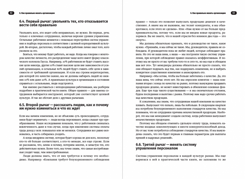 Большая часть книги посвящена практическим действиям - опираясь на инструкции автора, можно оценить сильные и слабые стороны своего бизнеса, определить цель изменений и сформировать план трансформации. Для этого предлагается использовать четыре рычага: отбор персонала, трансляцию новых ценностей и программы изменений, улучшение бизнес-процессов и смену системы управления.