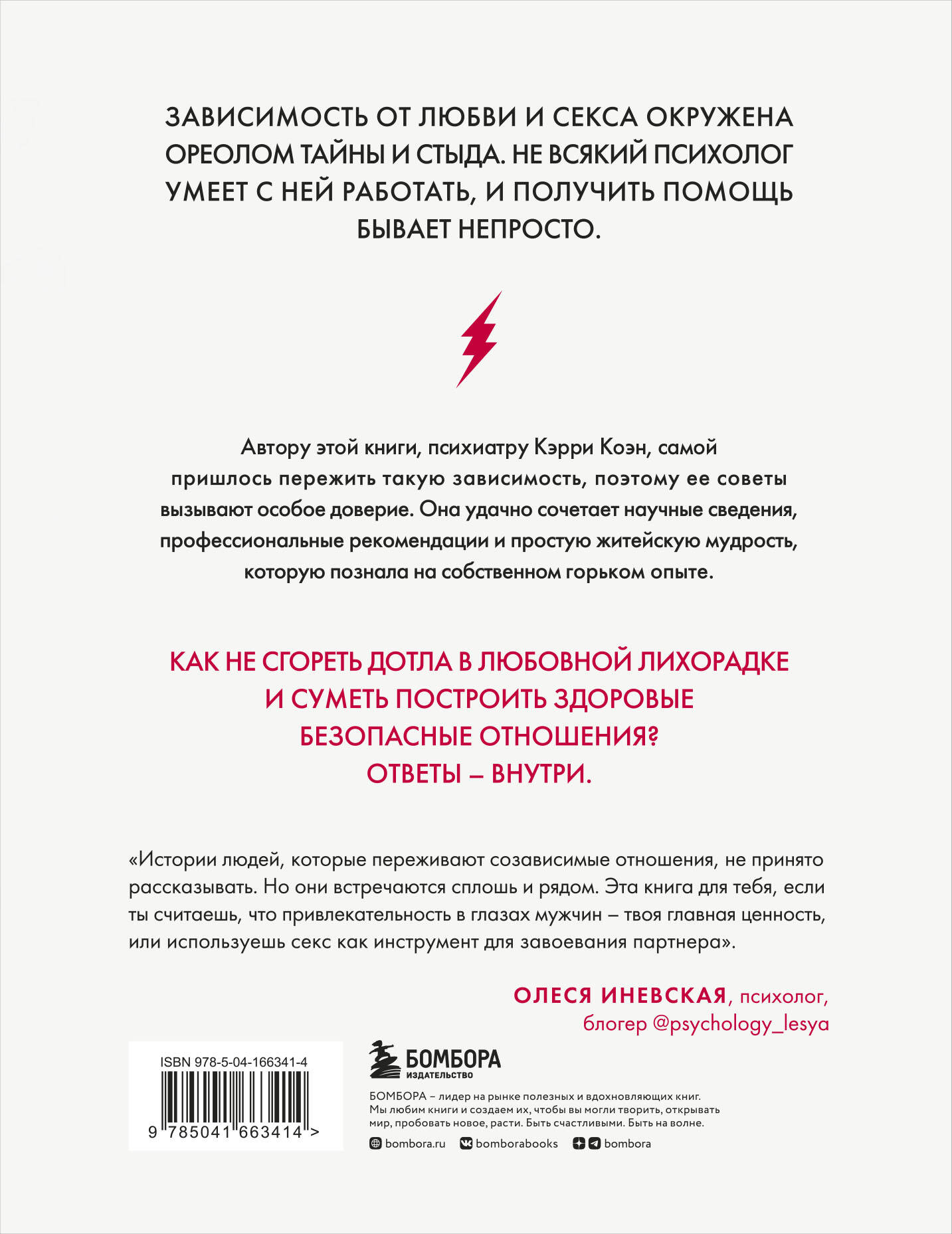 Зависимость от любви и секса окружена ореолом тайны и стыда. Не всякий психолог умеет с ней работать, и получить помощь бывает непросто. Автору этой книги, клиническому психологу Керри Коэн, самой пришлось пережить такую зависимость, поэтому ее советы на страницах этой книги вызывают особое доверие. Она удачно сочетает научные сведения, профессиональные рекомендации и простую житейскую мудрость, которую познала на собственном горьком опыте. Как не сгореть дотла в любовной лихорадке и суметь построить здоровые безопасные отношения? Ответы - внутри. Если вы задавались вопросами: почему у всех все получается в личной жизни, а у меня нет; что со мной не так; почему любить так тяжело; как сделать отношения более здоровыми и безопасными, - эта книга для вас. «Истории людей, которые переживают созависимые отношения, не принято рассказывать. Но они встречаются сплошь и рядом. Эта книга для тебя, если ты считаешь, что привлекательность в глазах мужчин - твоя главная ценность, или используешь секс как инструмент для завоевания партнера». - Олеся Иневская, психолог, блогер@psychology_lesya| Издательство | ООО "Издательство "Эксмо" |