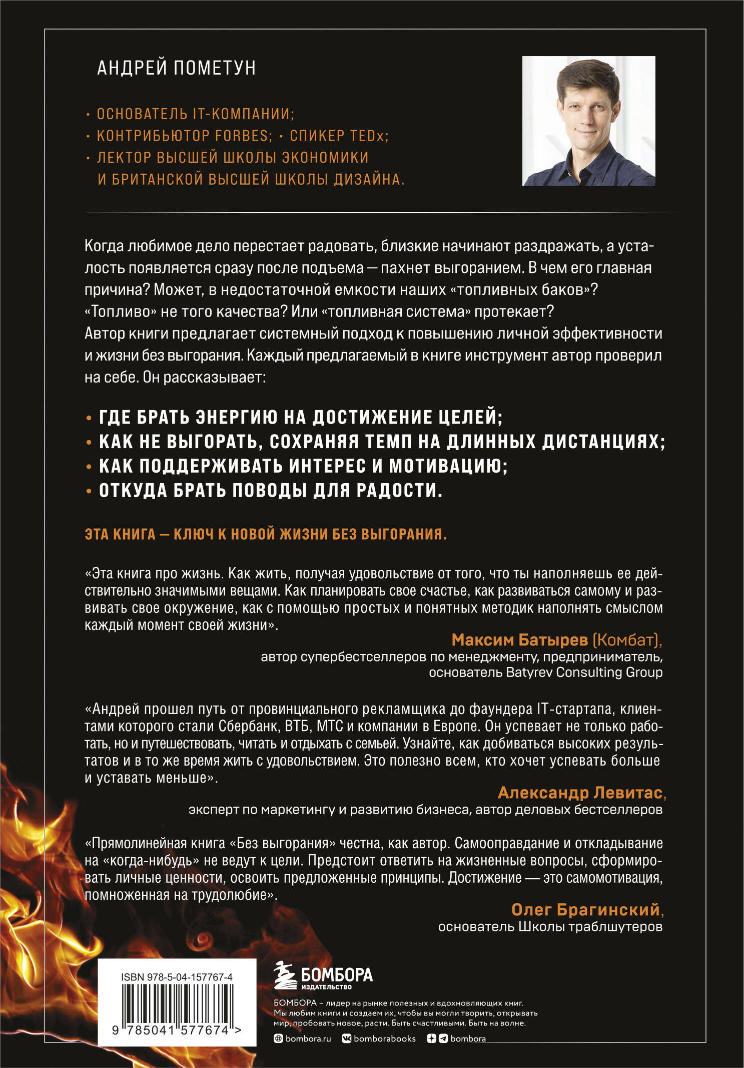 Когда любимое дело перестает радовать, близкие начинают раздражать, а усталость появляется сразу после подъема - пахнет выгоранием. В чем его главная причина? Может, в недостаточной емкости наших «топливных баков»? «Топливо» не того качества? Или «топливная система» протекает? Автор книги Андрей Пометун - основатель IT-компании, контрибьютор Forbes, спикер TEDx и лектор Высшей школы экономики. Он предлагает системный подход к повышению личной эффективности и жизни без выгорания. Каждый предлагаемый в книге инструмент автор проверил на себе. Он рассказывает: • где брать энергию на достижение целей; • как не выгорать, сохраняя темп на длинных дистанциях; • как поддерживать интерес и мотивацию; • откуда брать поводы для радости. Эта книга - ключ к новой жизни без выгорания.| Издательство | ООО "Издательство "Эксмо" |