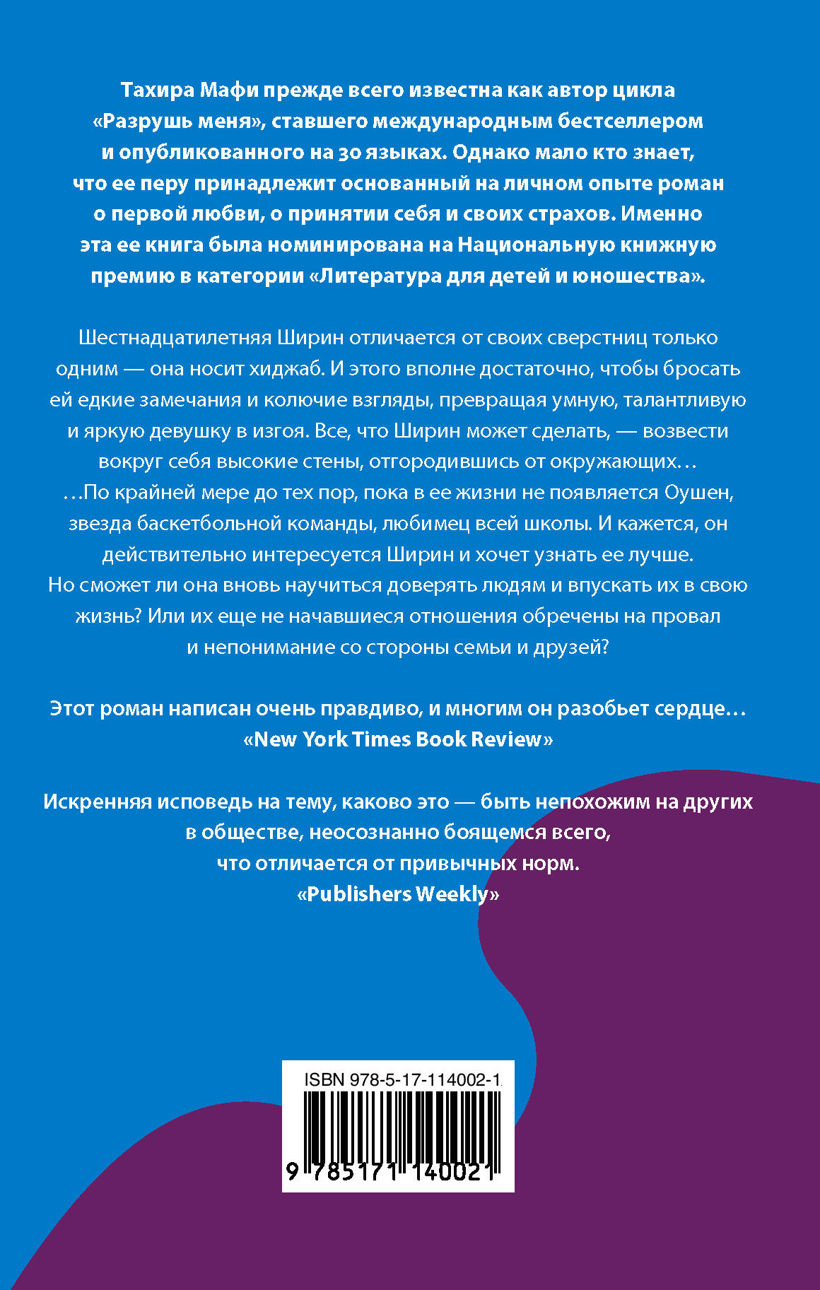 Шестнадцатилетняя Ширин отличается от своих сверстниц только одним - она носит хиджаб. И этого вполне достаточно, чтобы бросать ей едкие замечания и колючие взгляды, превращая умную, талантливую и яркую девушку в изгоя. Все, что Ширин может сделать, - возвести вокруг себя высокие стены, отгородившись от окружающих… …По крайней мере до тех пор, пока в ее жизни не появляется Оушен, звезда баскетбольной команды, любимец всей школы. И кажется, он действительно интересуется Ширин и хочет узнать ее лучше. Но сможет ли она вновь научиться доверять людям и впускать их в свою жизнь? Или их еще не начавшиеся отношения обречены на провал и непонимание со стороны семьи и друзей?| Издательство | ИЗДАТЕЛЬСТВО "АСТ" |