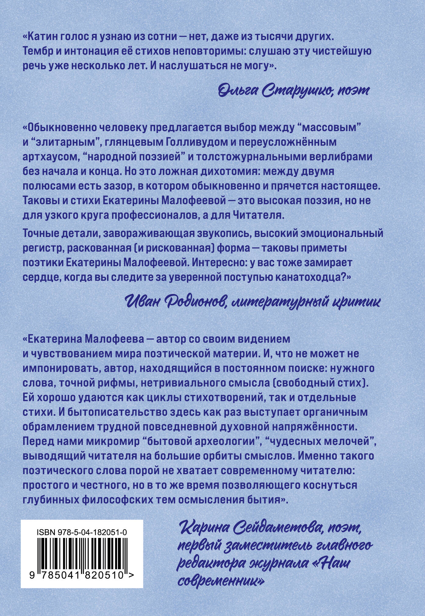 «Точные детали, завораживающая звукопись, высокий эмоциональный регистр, раскованная (и рискованная) форма - таковы приметы поэтики Екатерины Малофеевой», - пишет критик Иван Родионов. И действительно: сборник «Бездомные звёзды» открывает читателю удивительные созвездия, созданные поэтессой: современные, самобытные и завораживающие, способные подсказать читателю дорогу к новым поэтическим мирам. Это настоящая современная поэзия, чутко улавливающая настроения и надежды наших дней, способная врачевать душевные раны и, как путеводная звезда, направлять читателя, плутающего в лабиринте противоречивых чувств.| Издательство | ООО "Издательство "Эксмо" |